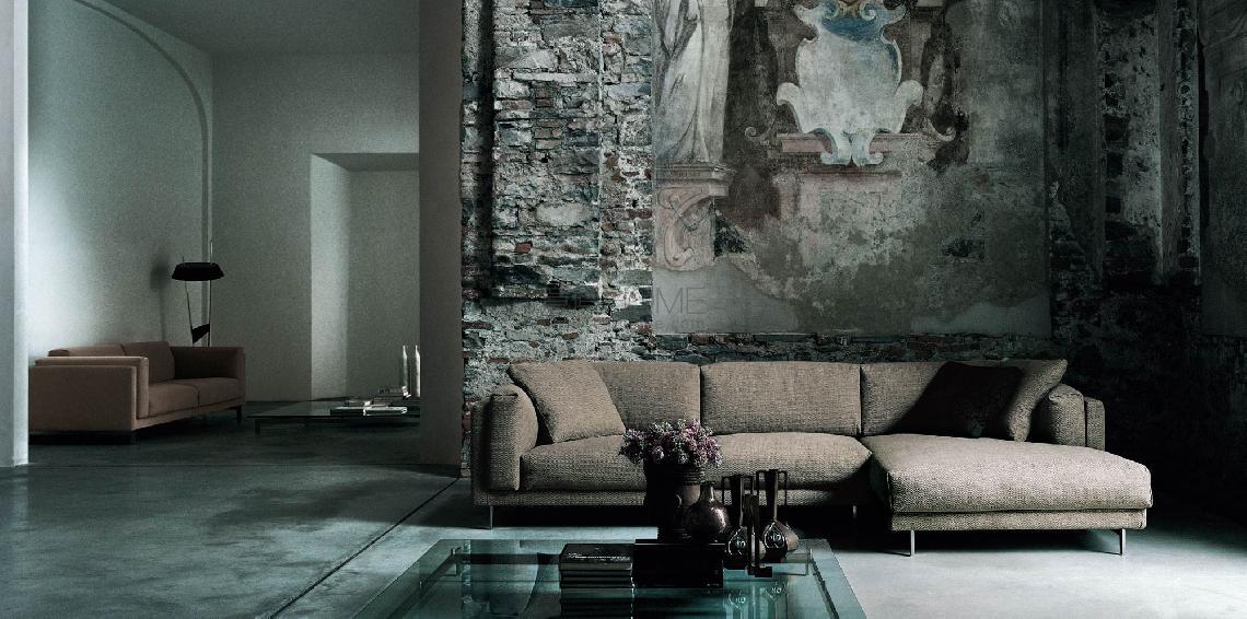 Fix sofa with one-piece frame in double-paneled poplar and pine. Steel seat chassis with support in cross-woven, coated rubber elastic straps. Shell padding in differentiated density polyurethane foam. Covering in needle punched, resinated, non-woven polyester fibre, bonded onto a polyamide velveteen backing. Seat, back and armrest cushions in prewashed and sterilized goose down, stitched into separate compartments, with preformed polyurethane foam insert, or in polyurethane foam, coated with acrylic fibre layers. Steel feet, with satin nickel finish joined by a bracket. Fabric or leather upholstery. The fabric version only is fully removable by zippers and Velcro fastenings. The leather version is always with non-removable upholstery. Seat depth 62cm.