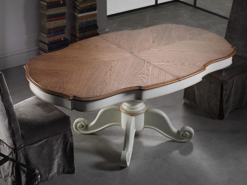 The worktop in oak, with angular decoration could be opened centrally, while the tick perimetral structure houses a 40 cm folded extension with flapping system device.