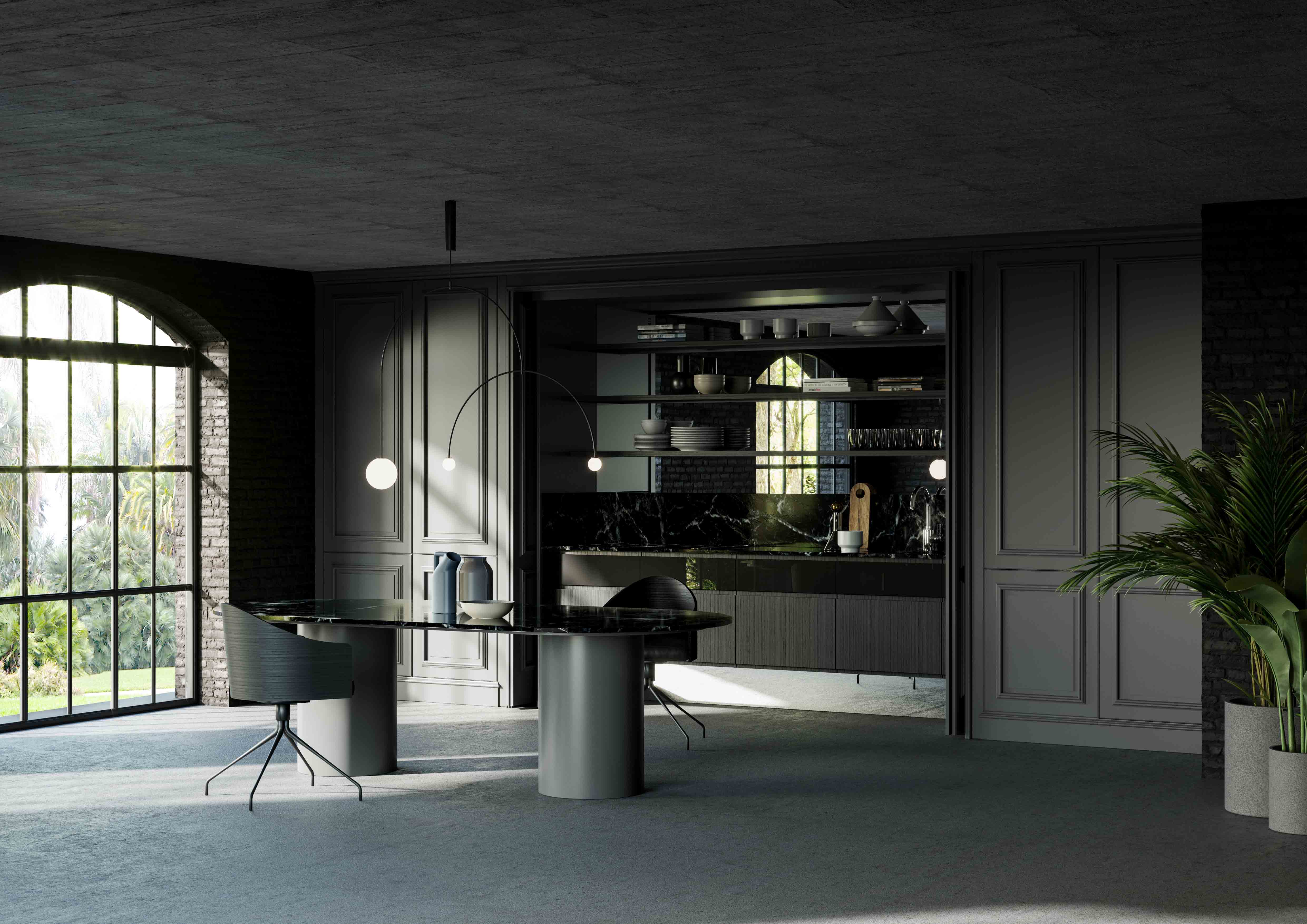 The Archetipo table, designed in collaboration with makethatstudio, is characterised by its elementary forms, a clear homage to the creative idea of Aldo Rossi, which are then reproduced in the island, the sideboard and the Archetipo occasional table.