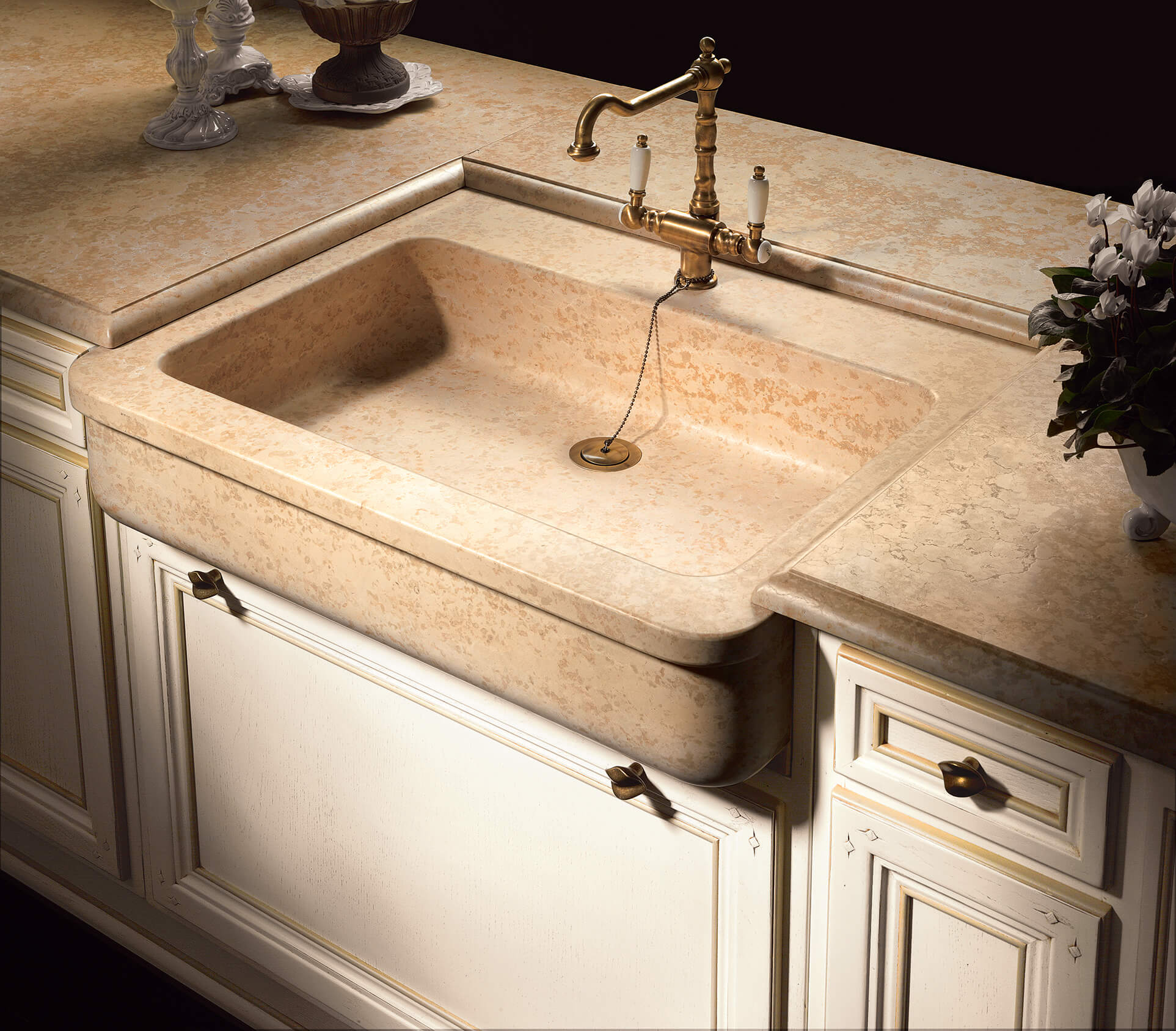 Monterey could be both a kitchen with island or peninsula element, it is characterized by the soft carving and the handicraft geometric decorations which match to traditional materials like marble or brass to define its character.