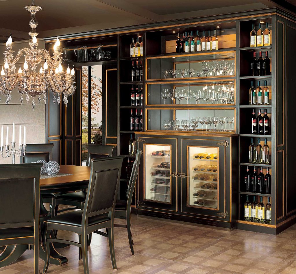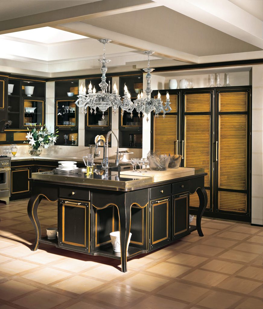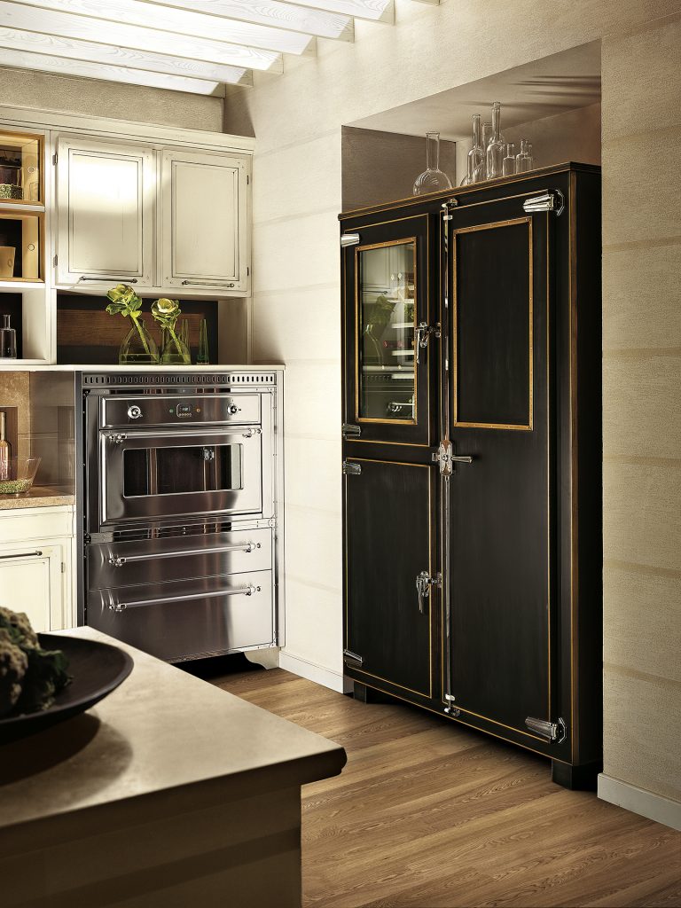 The metal details in old silver and antiqued brass confirm the character of these kitchens and propose contemporary solutions through the use of innovative technical elements, ergonomic devices, sliding doors and equipped drawers.
