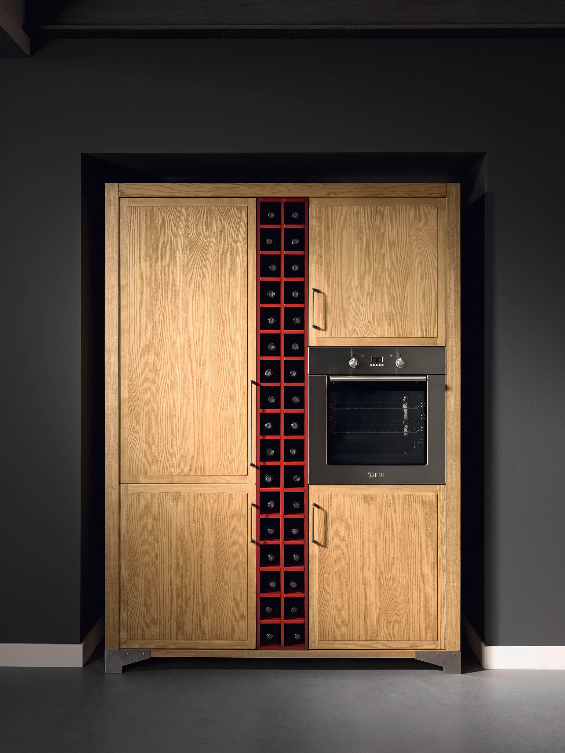 The proposal of this kitchen is completed through a set of precious and special elements as the ‘officina’ drawers system and the wide steel hood in vintage finishing.