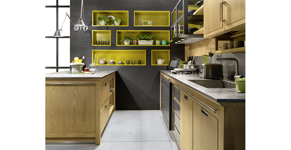 With Industrial Chic, characterized by the small framework door, tradition is combined to metropolitan spirit designing a kitchen to be completed by the built-in handle of cabinets and the curved handle of wall cabinets and tall units.
