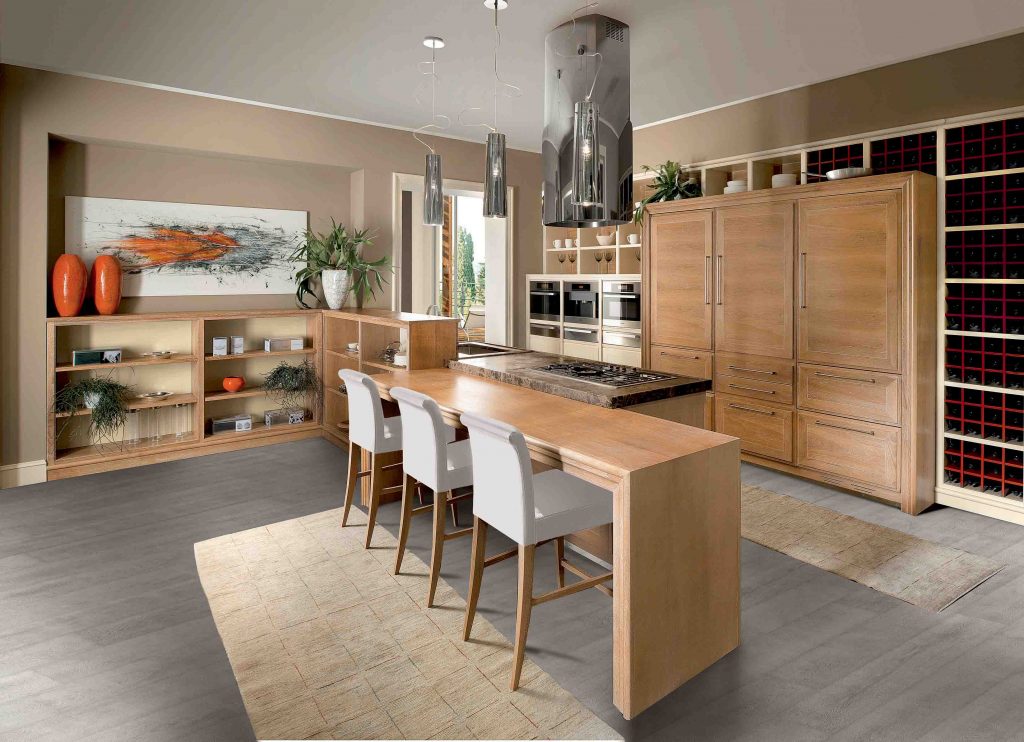 Solid wood, with its tenuous and natural veining, became the protagonist of the simple design of the Evita island or peninsula kitchen recalling fluid and open spaces.