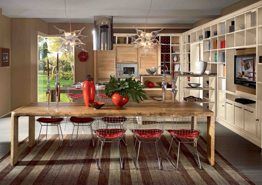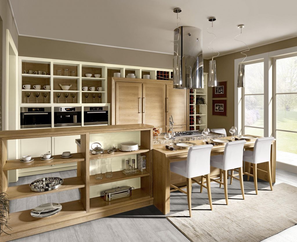 Evita renews the concept of warm atmosphere: kitchen opens on the living space in stylistic harmony with Calendario open compartments recalling the perimetral frame.