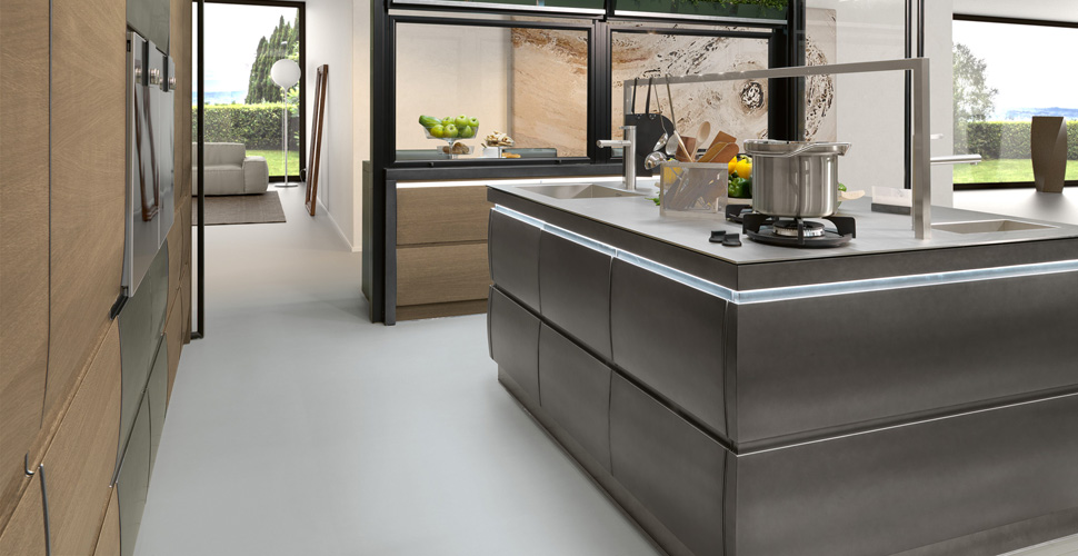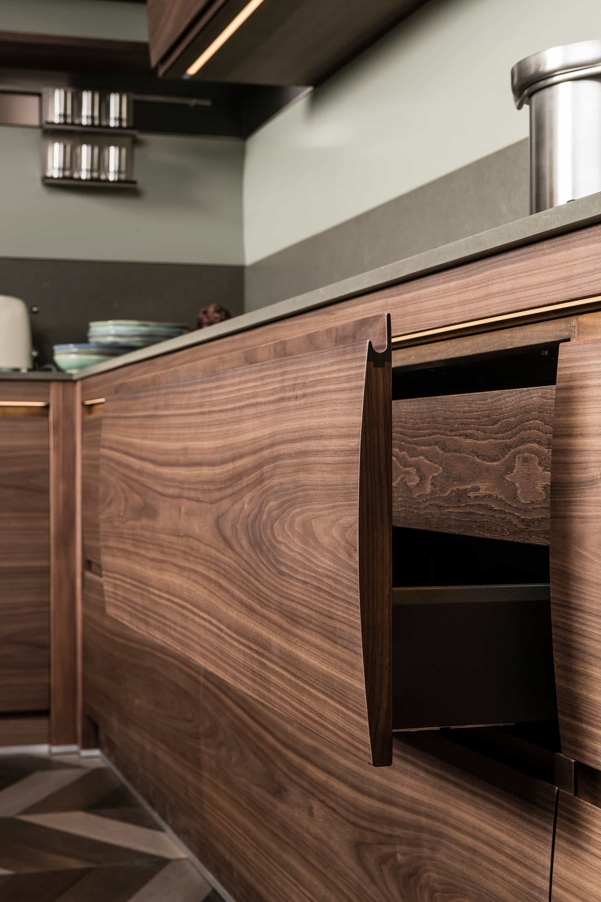 The drawers and the curved shaped doors of Chronos kitchen match the wooden edge. A total look with great material effect but softened by sinuous shapes.