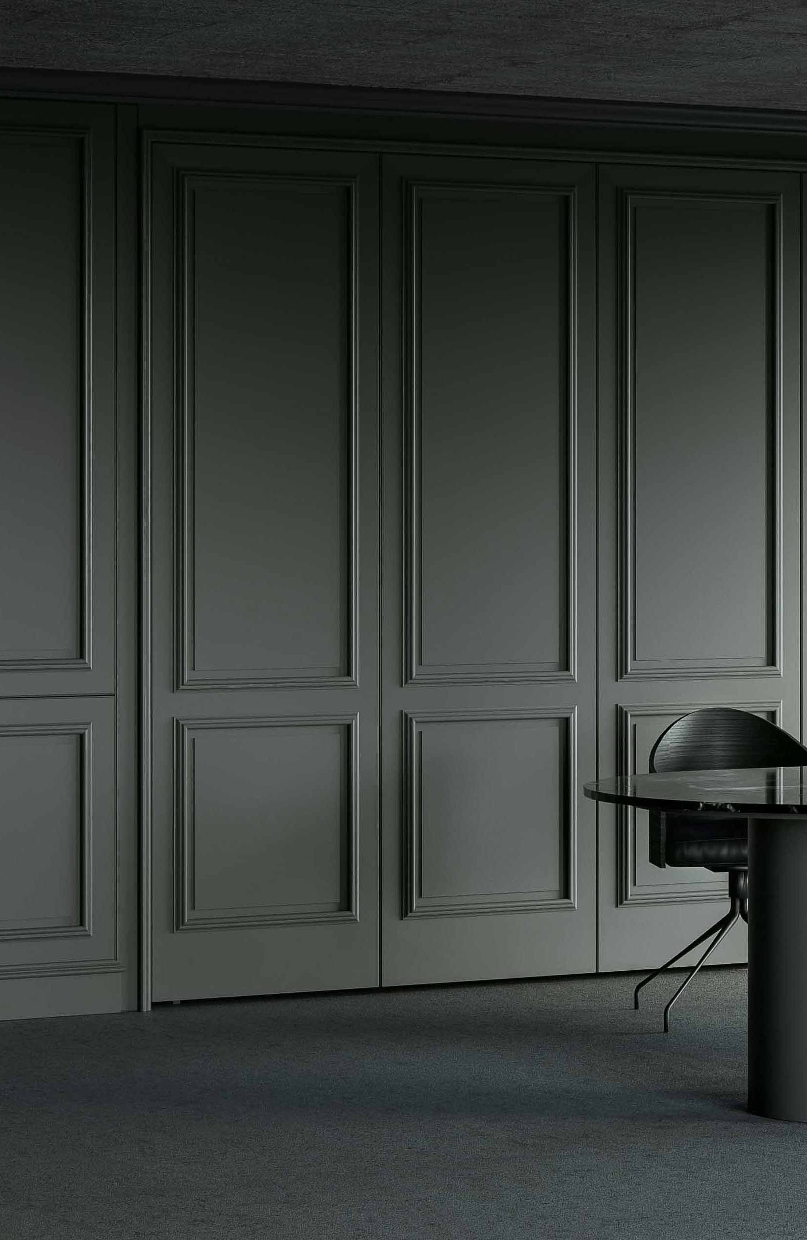 Archetipo doors with integrated handles represent a contemporary style enhanced by 6 mm thick lacquered and tempered glass glued on the surface of the drawers.