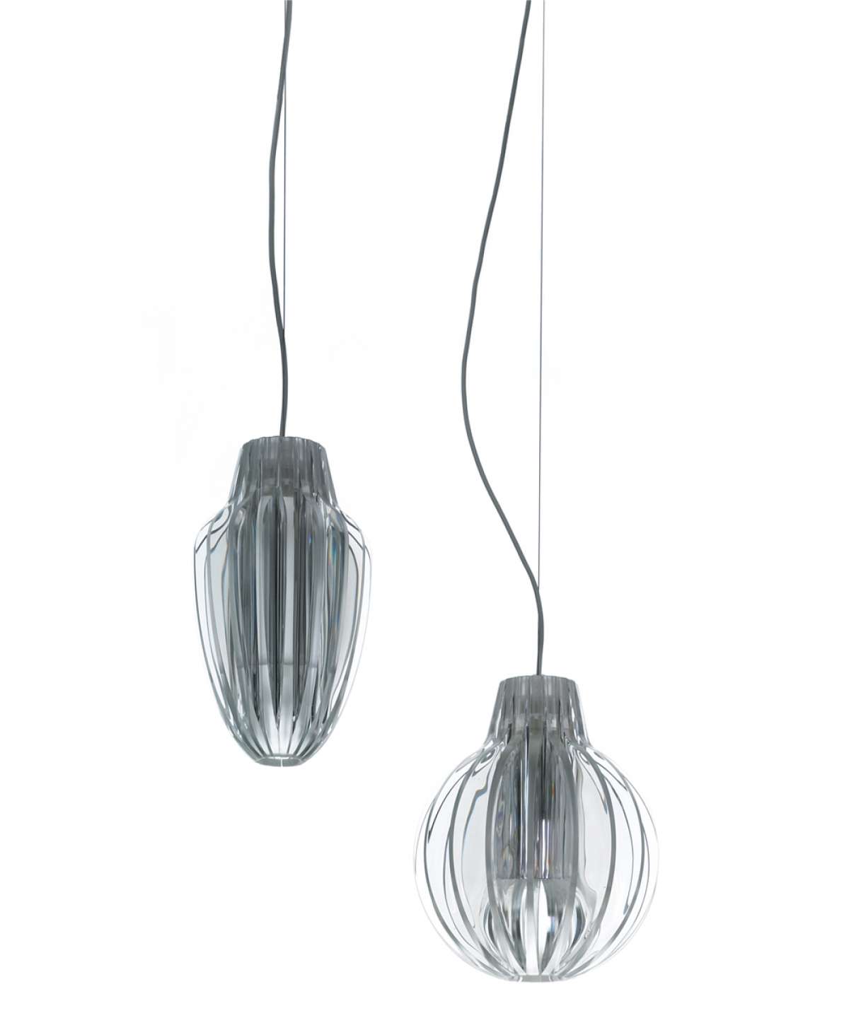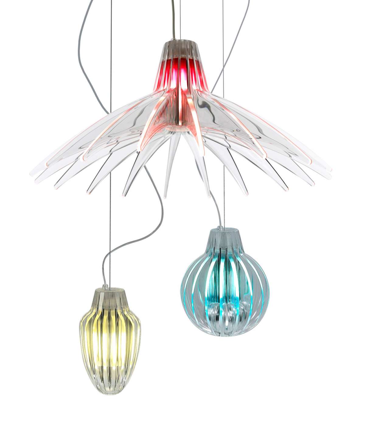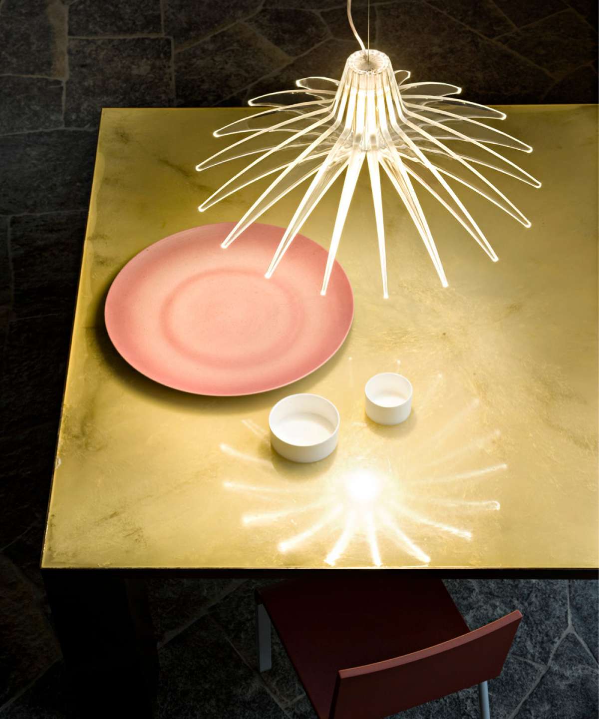 A game of transparency, reflection and refractions generates light with vivid visual impact. Three special filters can be superimposed to create chromatic effects. The radial structure of the transparent methacrylate ribs conceals the light source, preventing glare and light dispersion.