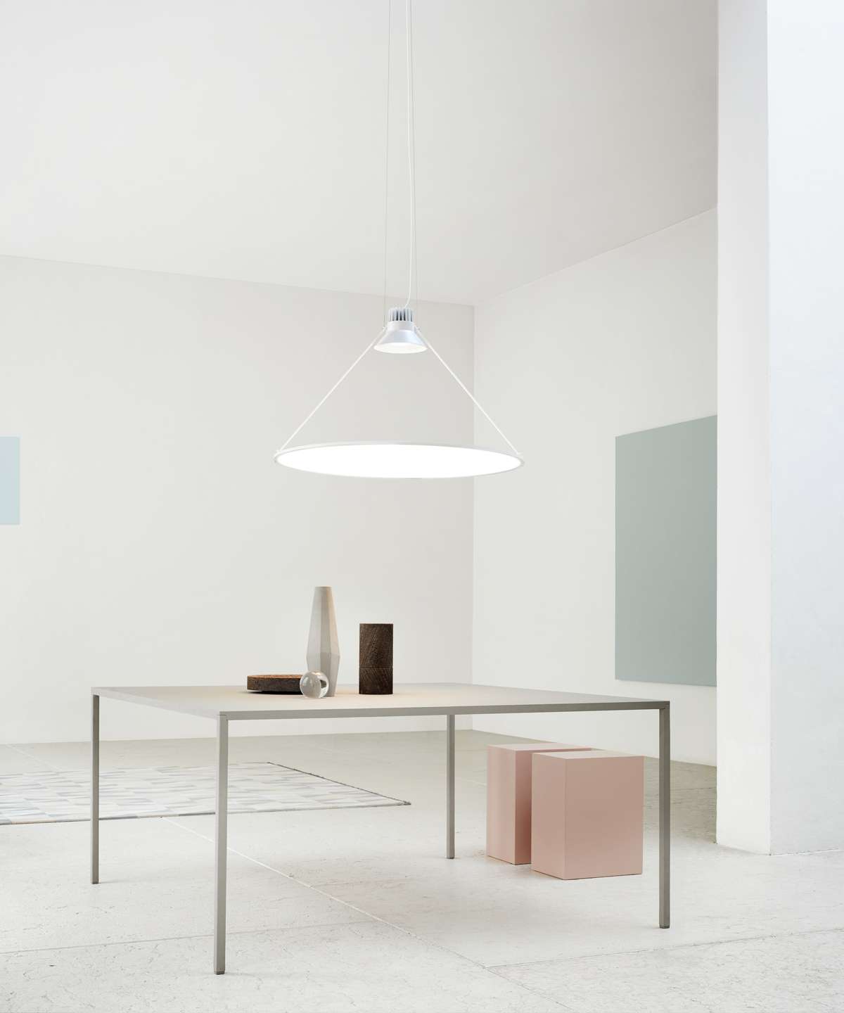 The Amisol project is about making a pendant light that occupies a large physical space with a minimal physical volume, for easy orientation in space. A translucent white fi lm or a metallized mirror membrane is stretched inside a circular aluminium profile. Like a solar sail, an incredibly powerful light source projects a beam of light onto the large, almost weightless disk, either diffusing or reflecting the light. Thin rods connect the two main elements together. By altering the length and the connecting points of the two supporting wires the rotation of the disk can be set in any angle.