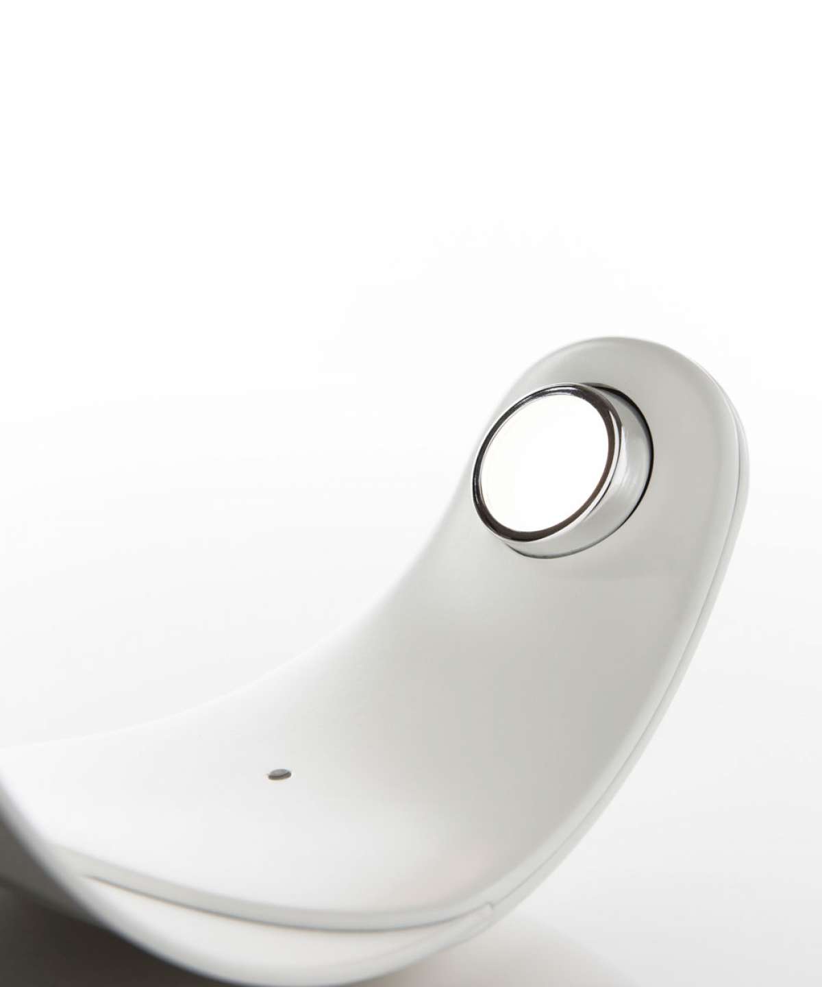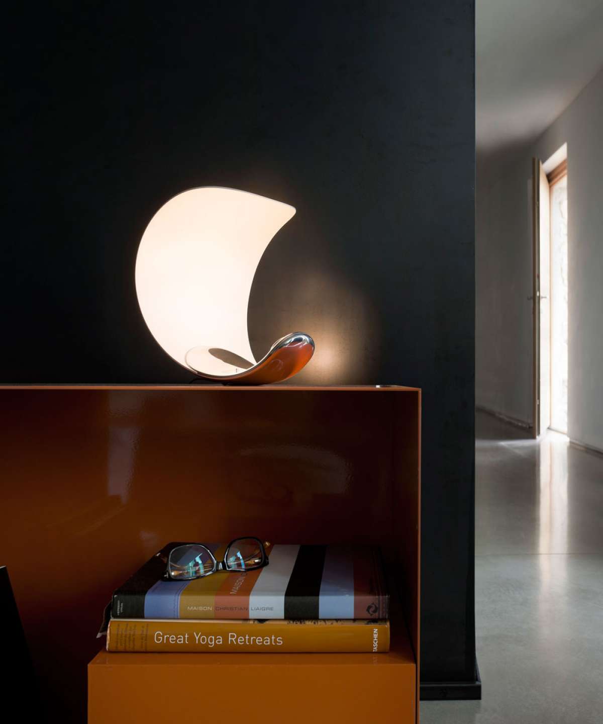 The Curl lamp is a device with well-balanced proportions and a natural sculptural presence. The typology of reference is the table lamp, a fixture to supply diffused light, shielding glare to create a restful atmosphere. The form of the base allows Curl to assume different positions; a dimmer switch is positioned at its center.