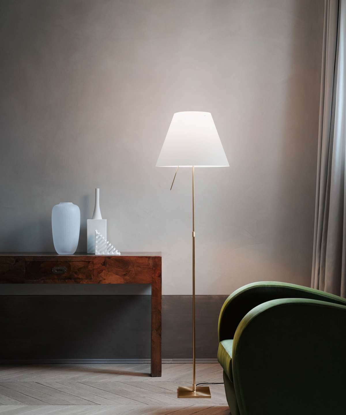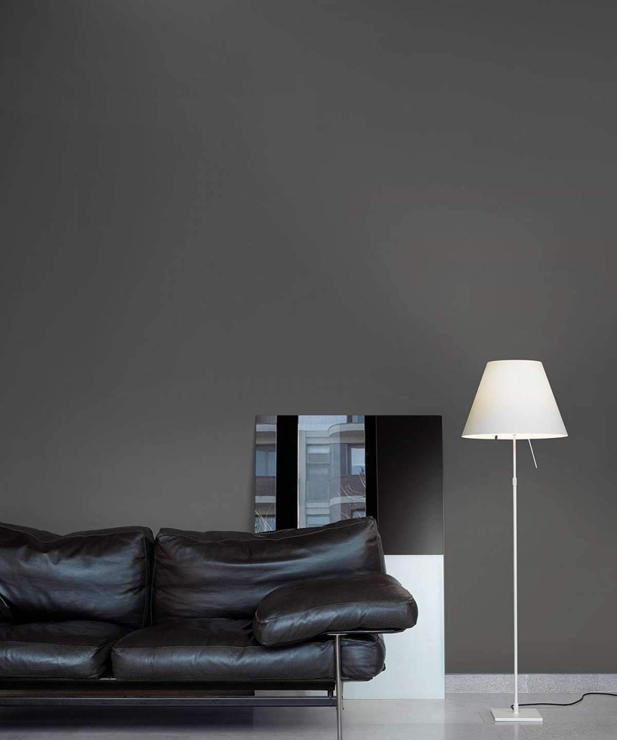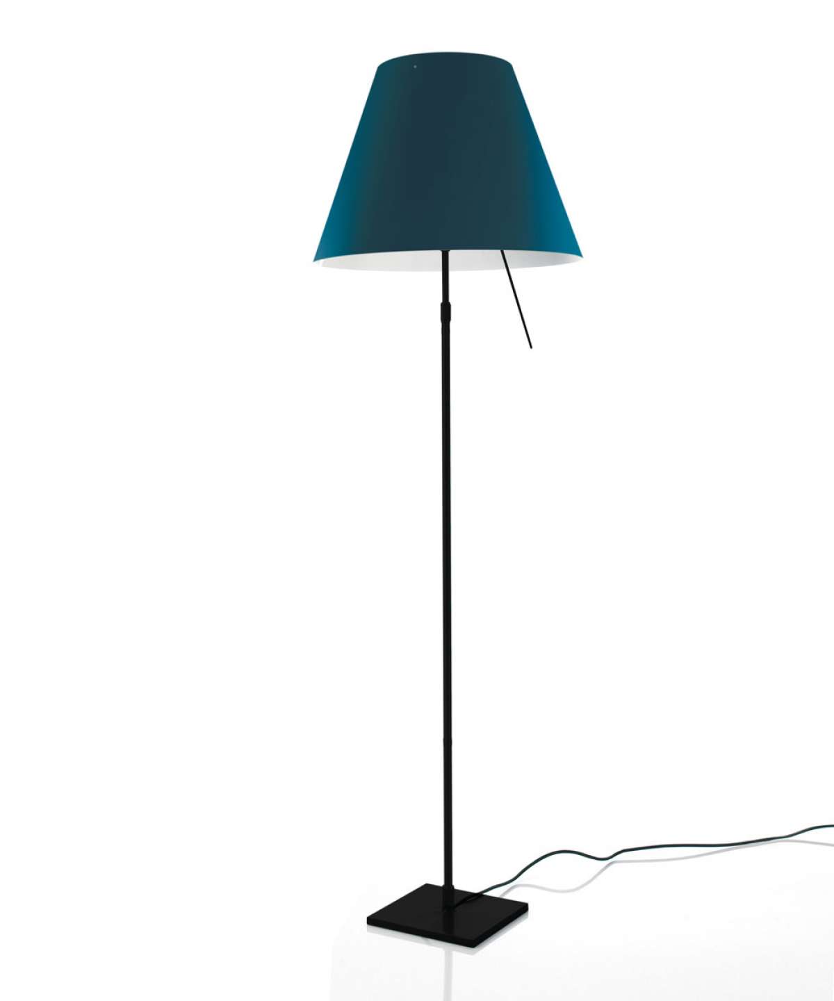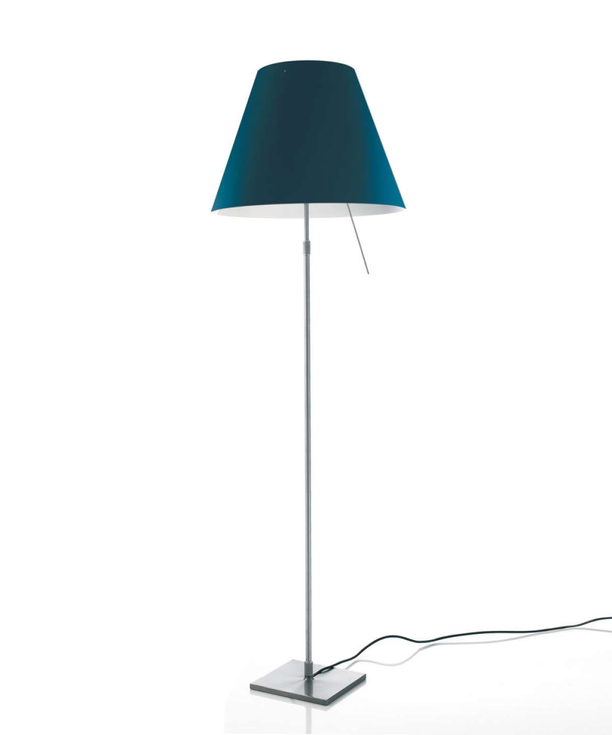 Elegant and light, this lamp emits a pleasant warm light through a silk-screened polycarbonate shade. The lamp’s height may be adjusted by means of a characteristic steel counterweight.