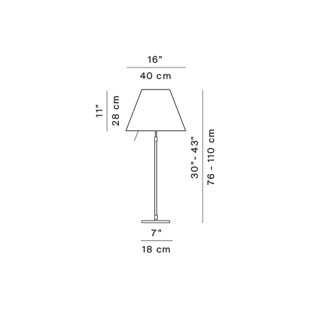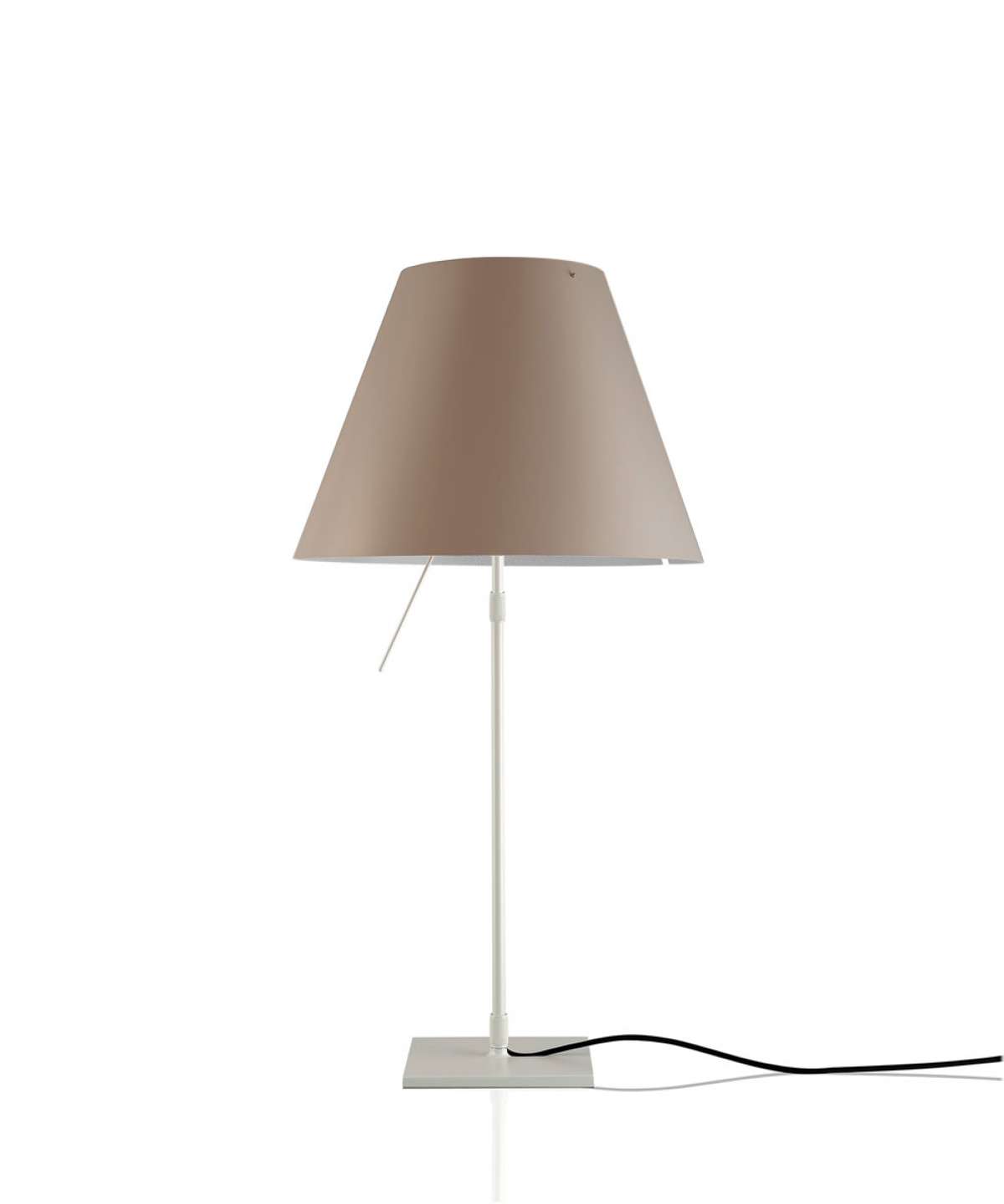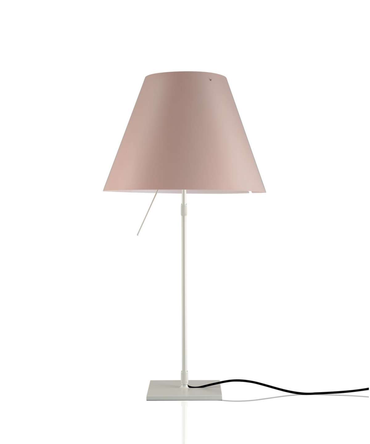 Elegant and light, this lamp emits a pleasant warm light through a silk-screened polycarbonate shade. The lamp’s height may be adjusted by means of a characteristic steel counterweight.