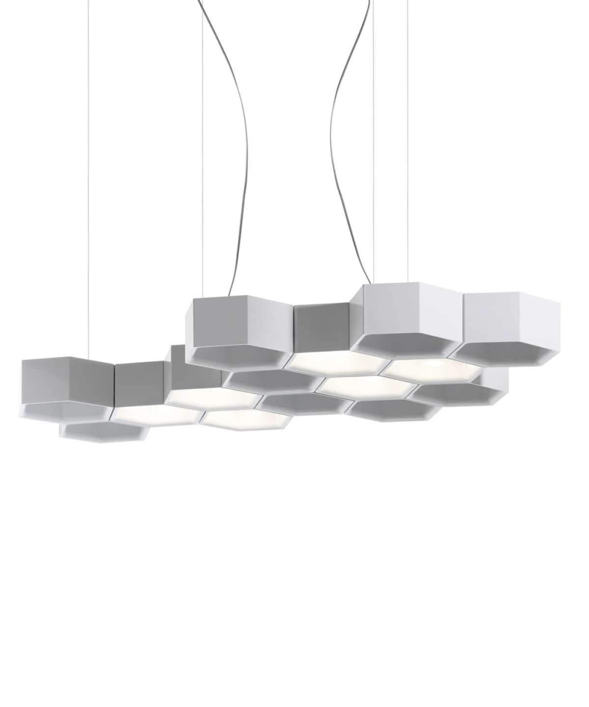 Like the cells of a beehive, the hexagonal modules of Honeycomb are freely grouped in a suspension lamp of captivating organic symmetry. The hexagons, connected by clips, form a self-supporting structure to contain energy-saving halogen and LED sources, for direct and indirect lighting.