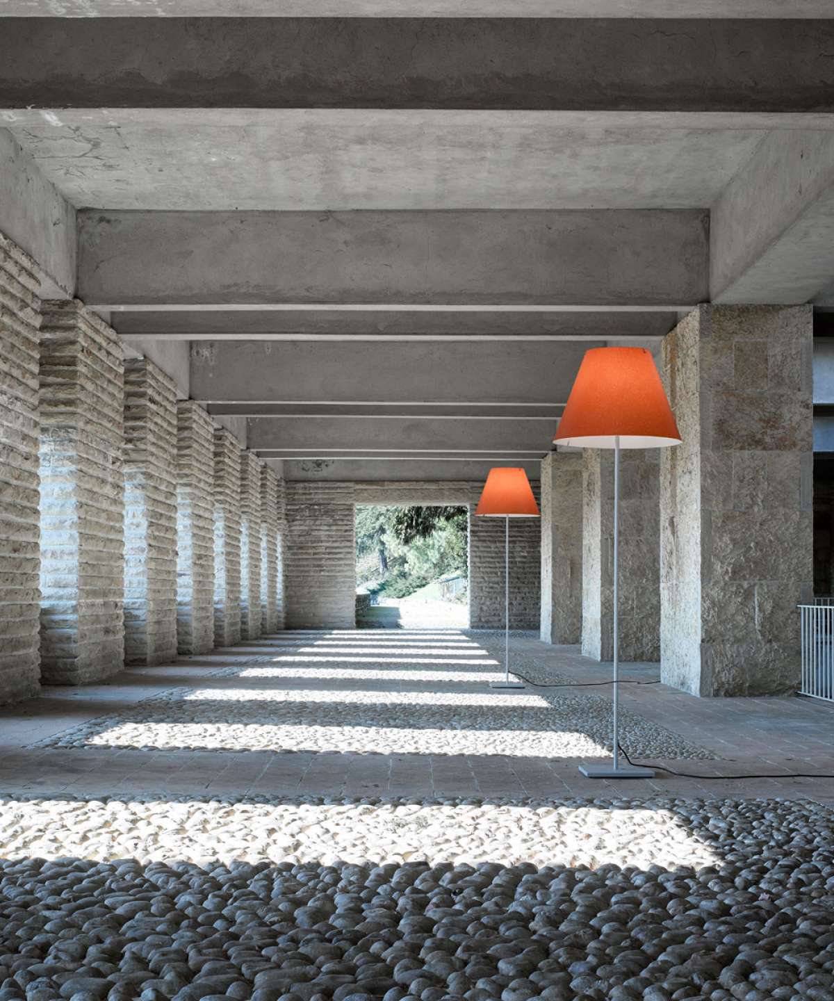 The outdoor version is perfect for terraces and gardens, to light spaces with elegance and efficiency. The shade comes in the colors ivory, rust or green. Stem in white, rust or aluminium.