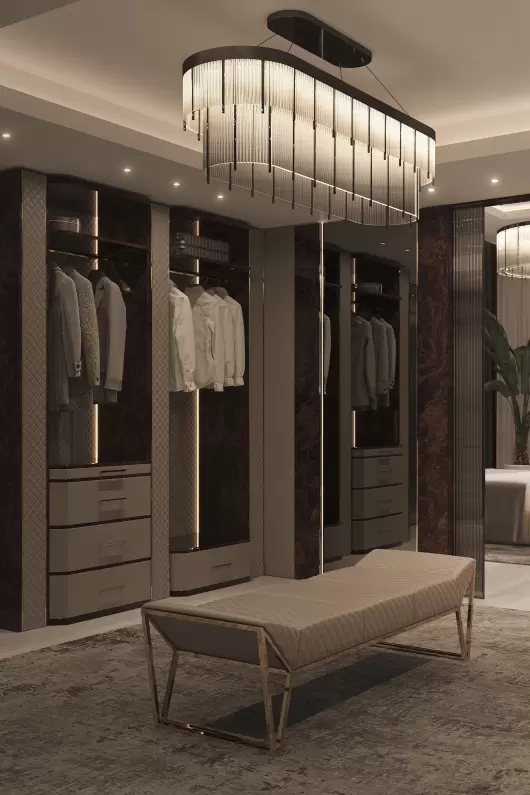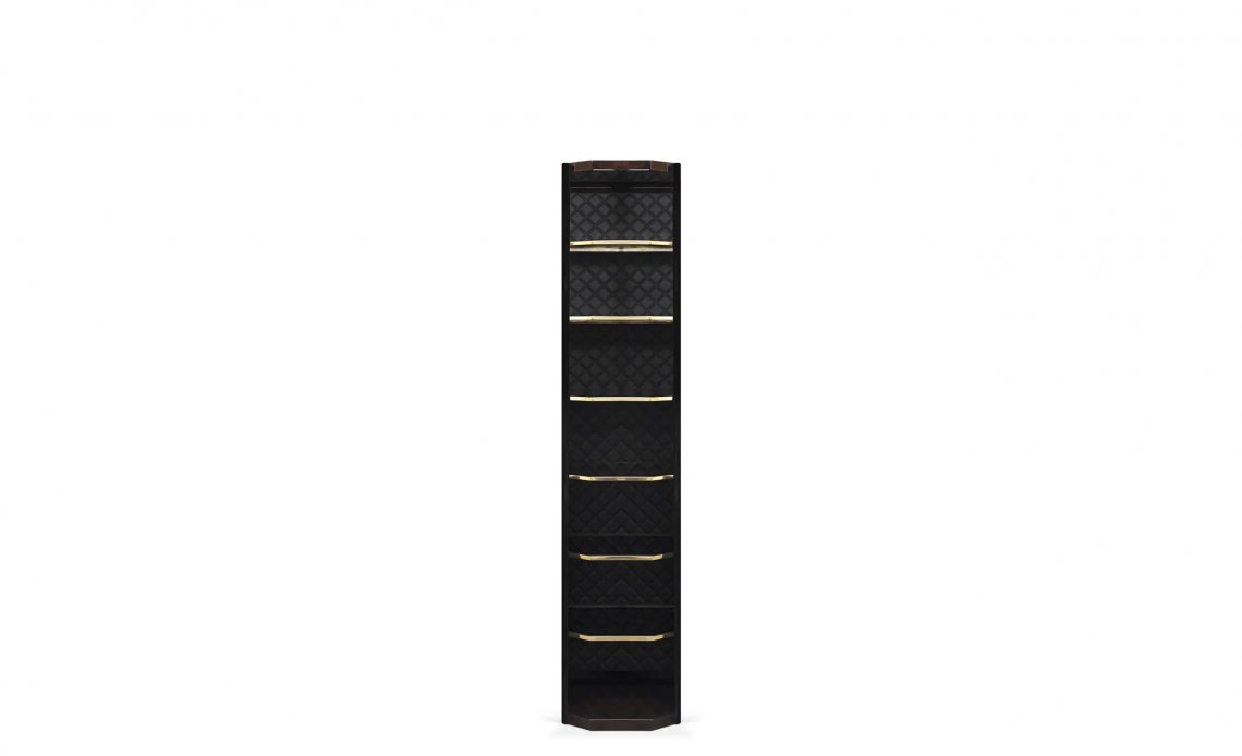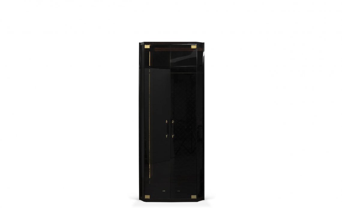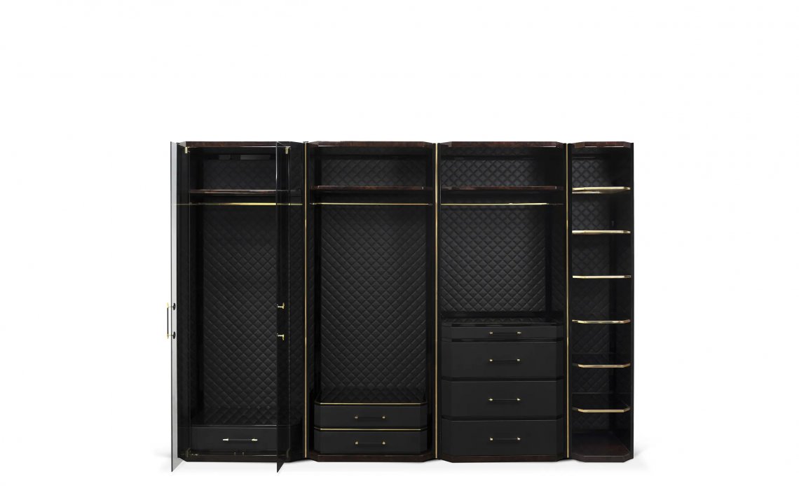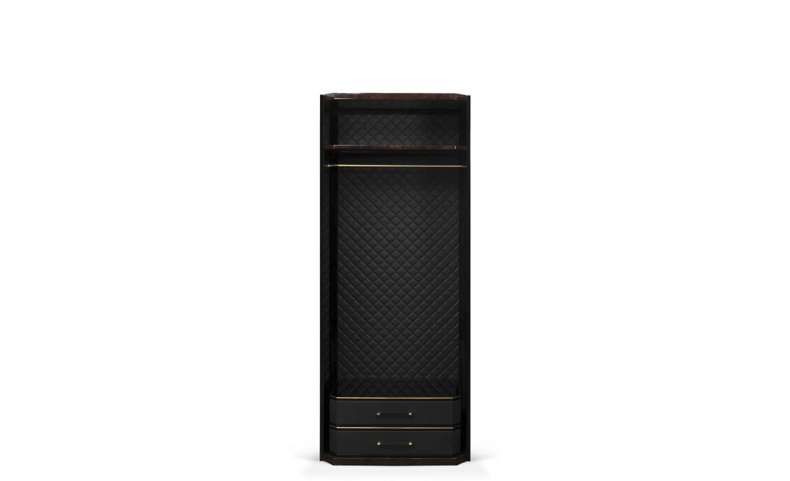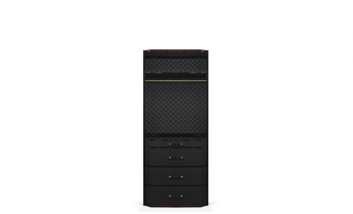 Waltz closet is an elegant modular clothing storage solution. Made with the finest materials, walnut root veneer, black leather, black lacquered wood, brass and smoked mirror. Waltz is the ideal closet for a luxury master bedroom offering a full customizable organization system featuring shelves, rods and drawers. The Waltz is a modular piece, allowing different module combinations to better fit into your space.