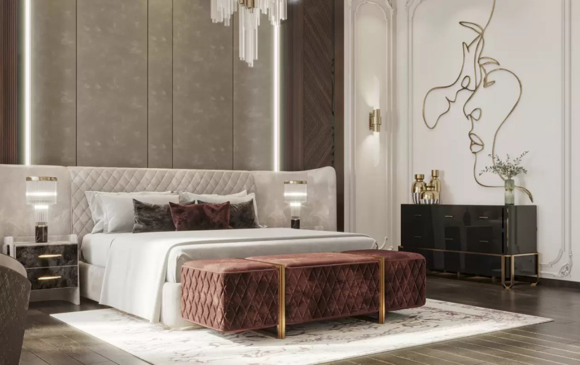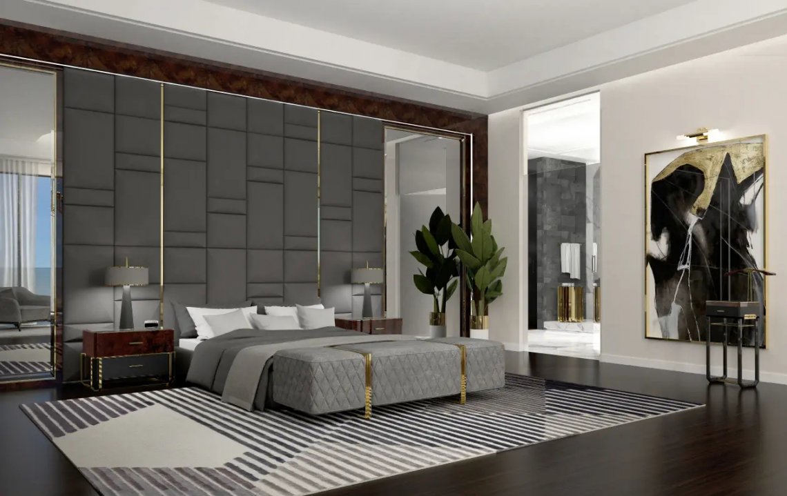 A highly stylish ottoman with a smooth and elegant shape. Made with grey velvet and with polished brass legs, this upholstered beauty will bring an attractive presence to any room, hotel suite, or master bedroom.