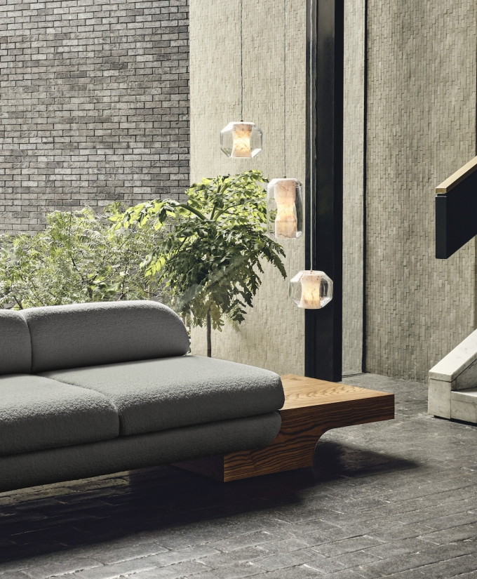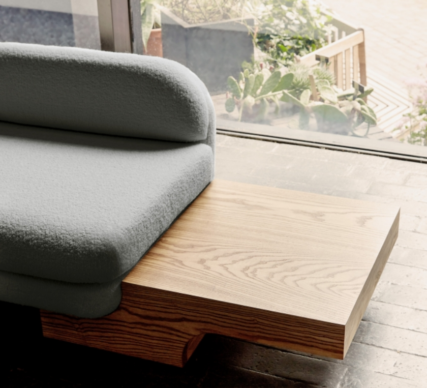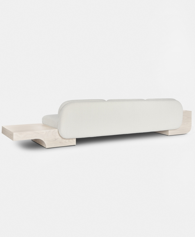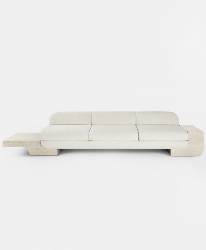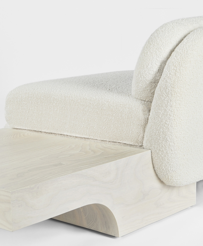 The White Street Sofa highlights Lee Broom’s long-held fascination with symmetry and seamlessness. This architectural, streamlined, modular piece can be arranged in multiple configurations and is effortlessly connected by sculpted armrests, corner or side tables, each produced in black or white ash. Shown in a sumptuous ivory bouclé by Dedar, but available in multiple colours, the sofa, with its expansive and curved back, appears to float, anchored only by its connectors. The White Street sofa is available as a two seat, three seat and corner configuration sofa.