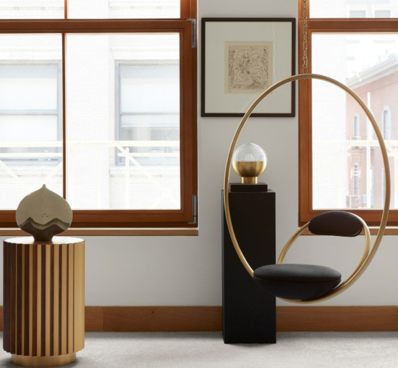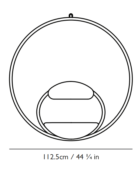Suspended from above, two black powder coated steel circular hoops join to create the Hanging Hoop Chair, with a seat and backrest upholstered in Kvadrat wool.