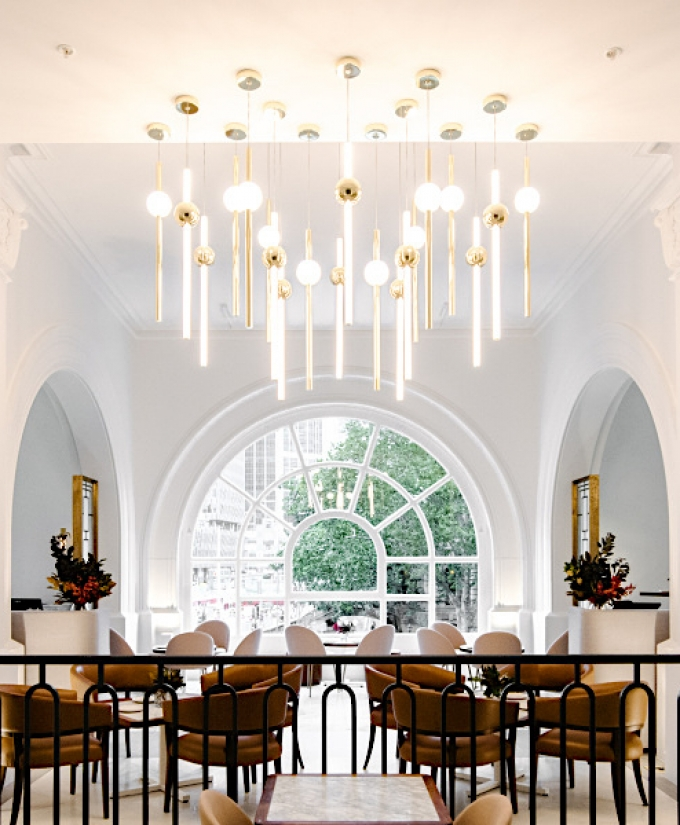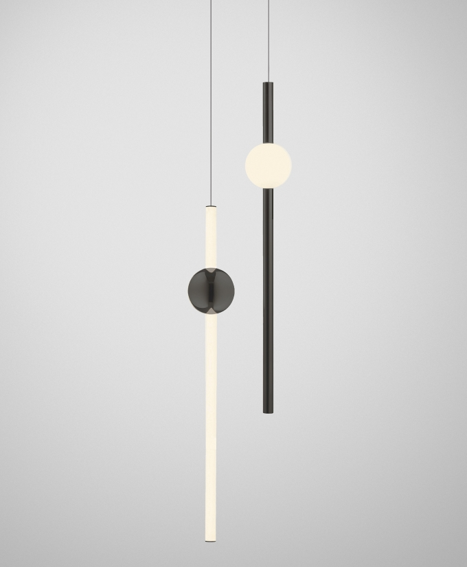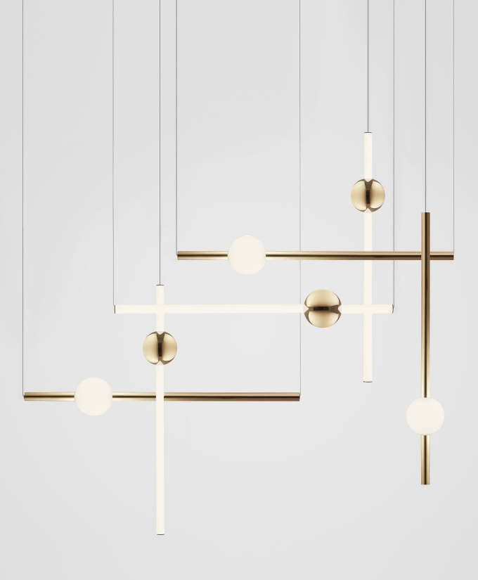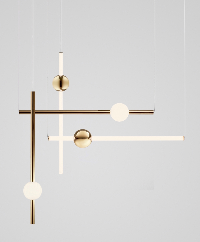 Orion comprises simple modular lights with opposing opaque and solid polished gold spheres along with opaque and solid polished gold tubes. These connect and expand horizontally and vertically to create bespoke constellations of light with infinite adaptations.