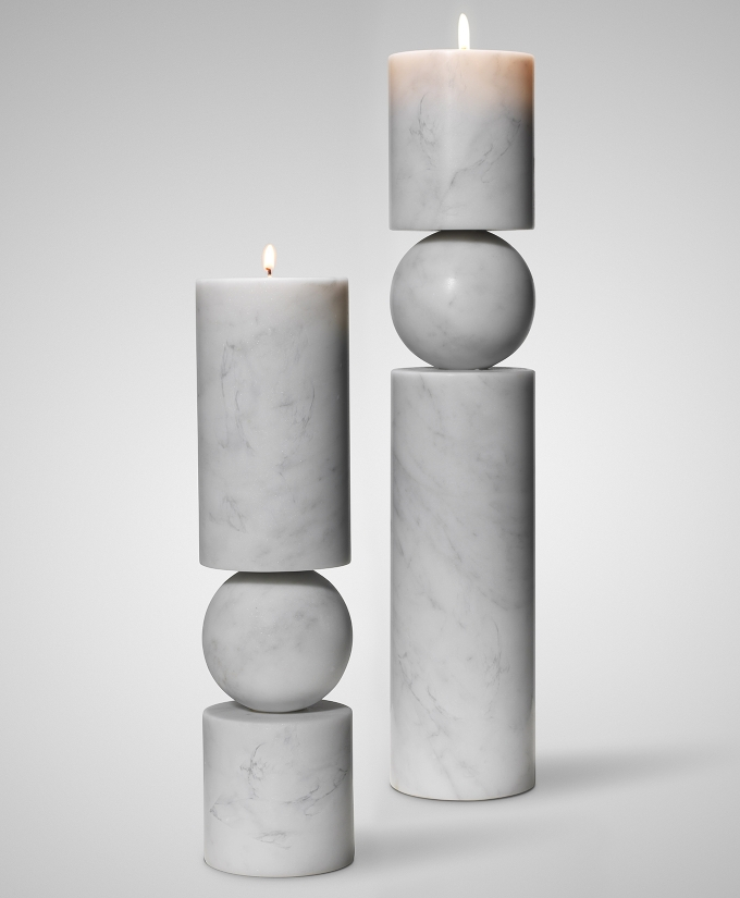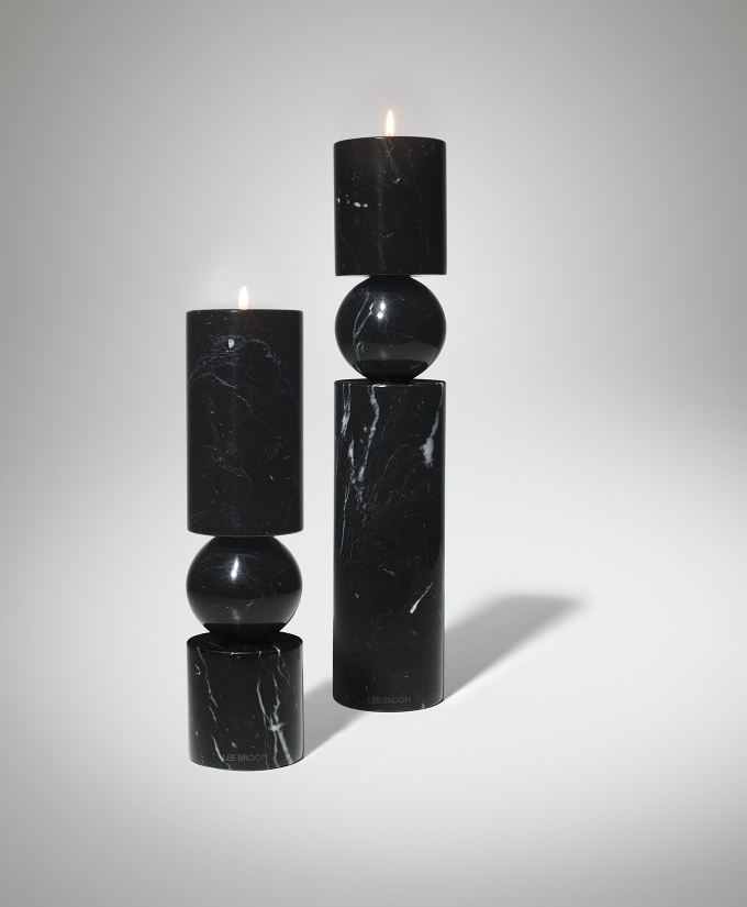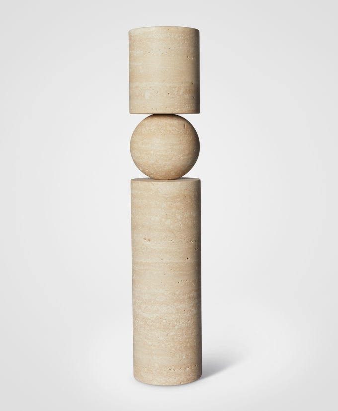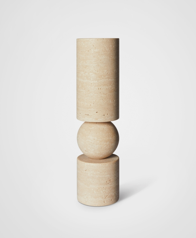 A new version of the Fulcrum candlestick has also been reimagined in a tactile, rough-hewn solid travertine. A play on the concept of pivots and supports, Fulcrum is a sculptural and monolithic candlestick whose cylindrical stem appears to balance on a central sphere.