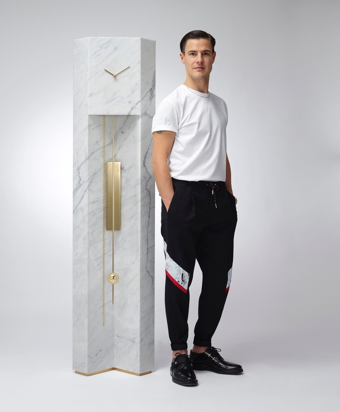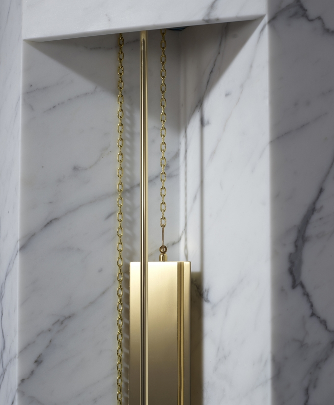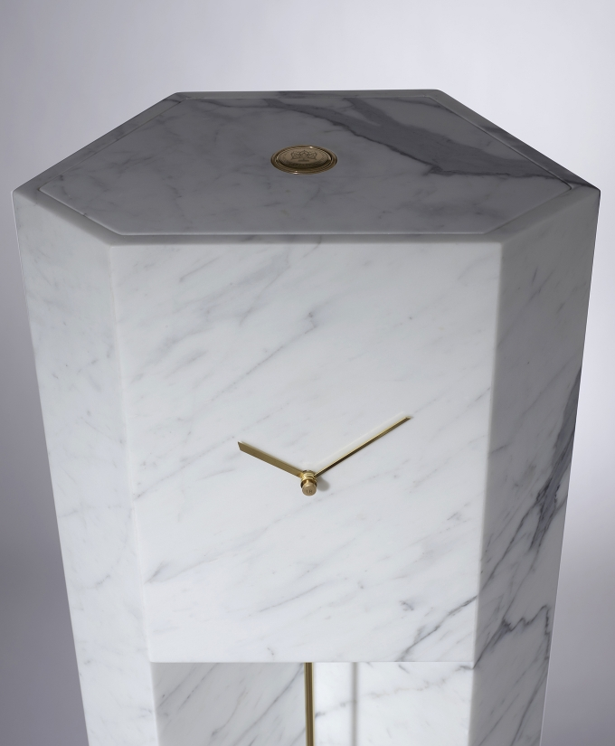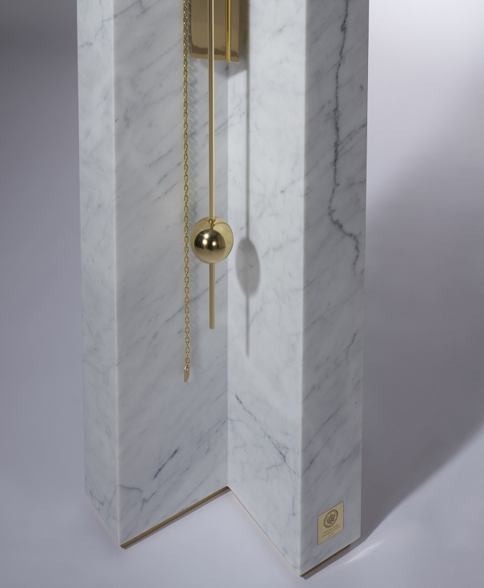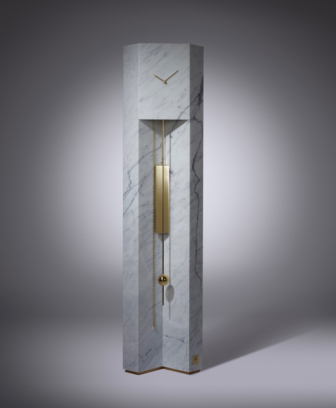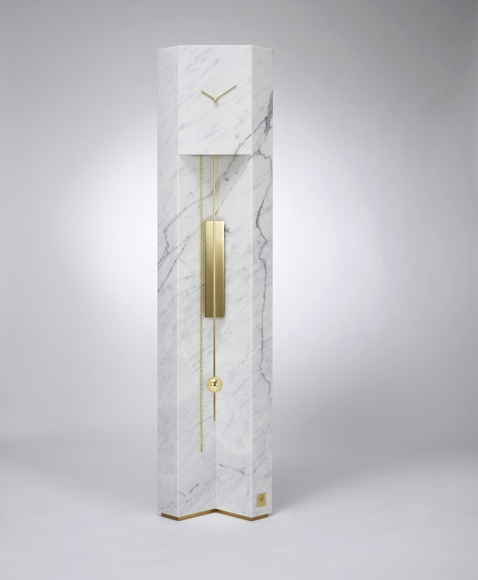 To celebrate a landmark decade in design, Time Machine is an exclusive statuesque marble grandfather clock. Hand-crafted from Carrara marble, the monolithic and commanding structure features a traditional engineered clock mechanism with solid brass pendulum, weight and hands.