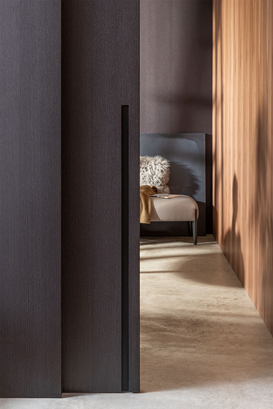 La porta per interni esterno muro Drive è un sistema combinato di porta scorrevole e di binario telescopico predisposto per essere installato direttamente a parete. Può leggersi come una superficie appoggiata alla parete.