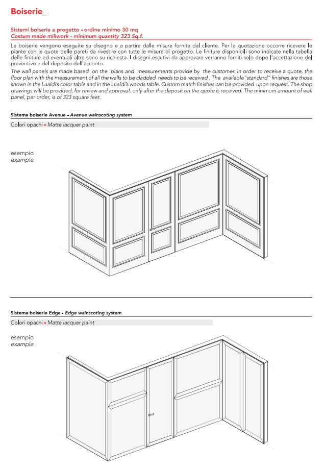 Edge boiserie is made using shaped panels, one side only. Finishes: matte lacquer paint. Dimensions: width from 600 mm up to 1200 mm; height max 3000 mm.