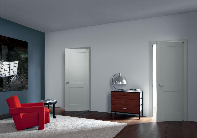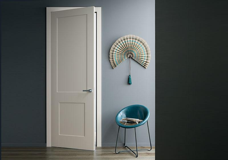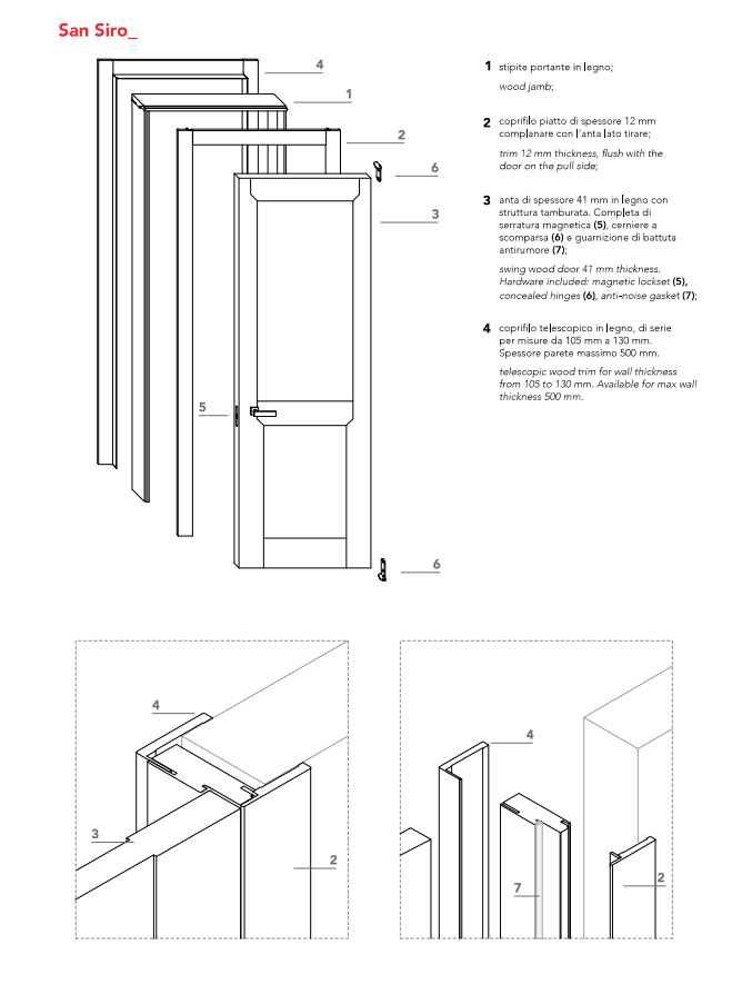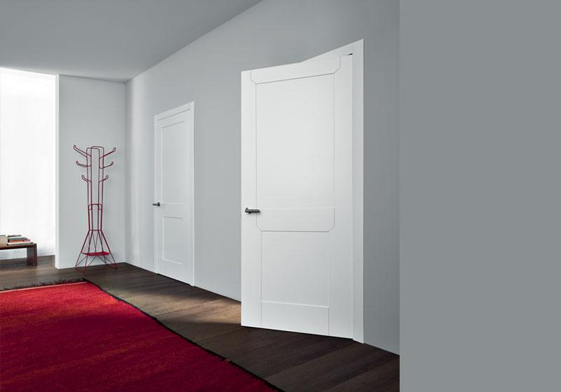 Swing wood door 41 mm thick. Magnetic lockset, concealed hinges and anti-noise gasket included. Woos jamb. Trim 12 mm thick, flush with the door on the pull side. Telescopic woos trim for wall thickness from 105 to 130 mm; available for max wall thickness 500 mm. Reversible opening direction. Concealed hinges. Mounted on traditional wooden subframe.