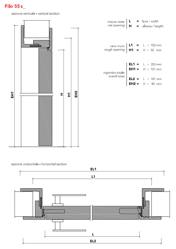 Swing wood door 55 mm thick. Magnetic lockset, concealed hinges and anti-noise gasket included. Trim 12 mm thickness: flush with the door on the push side (filo S) or flush with the door on the pull side (filo T). Telescopic wood trim for wall thickness from 105 to 130 mm; available for max wall thickness 500 mm.