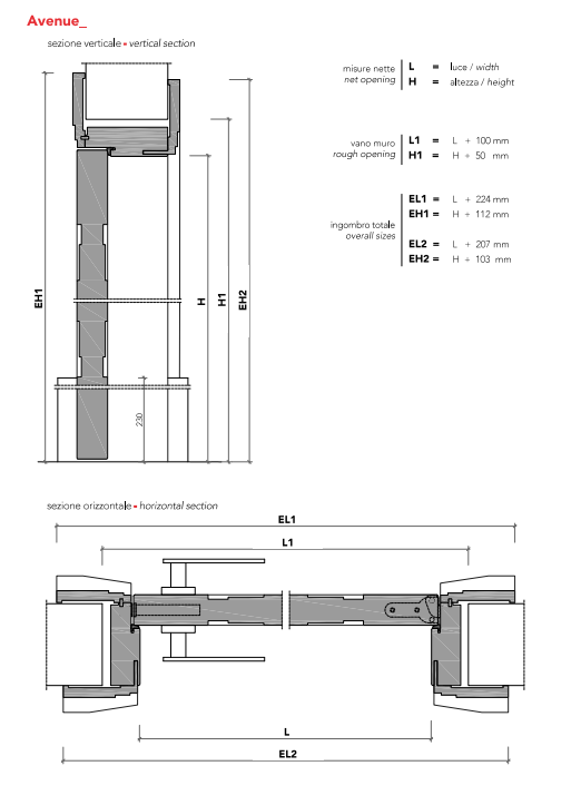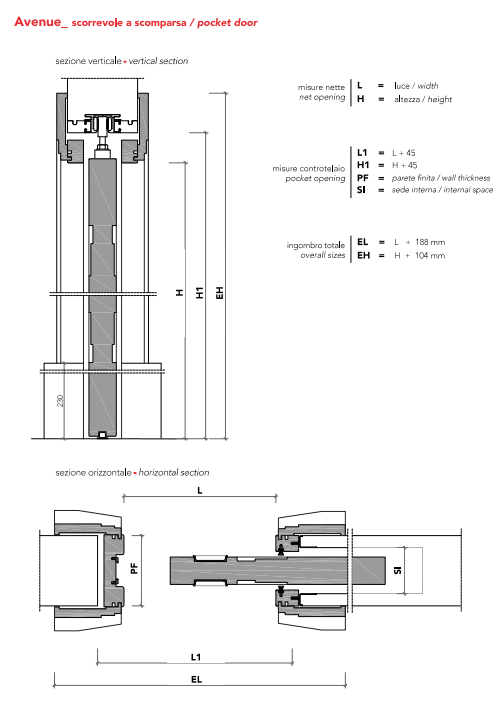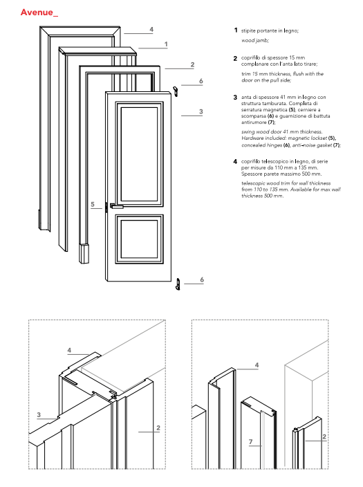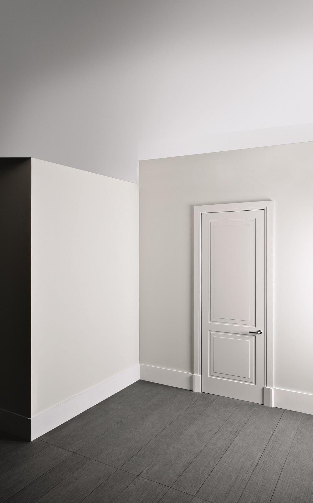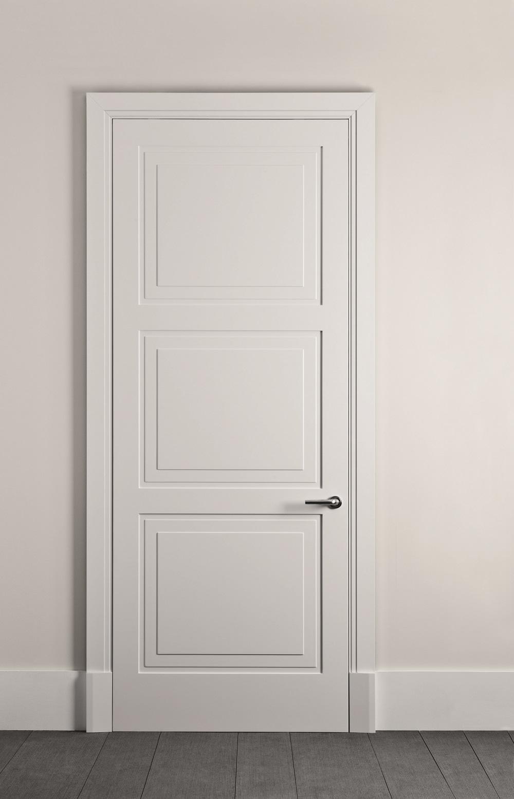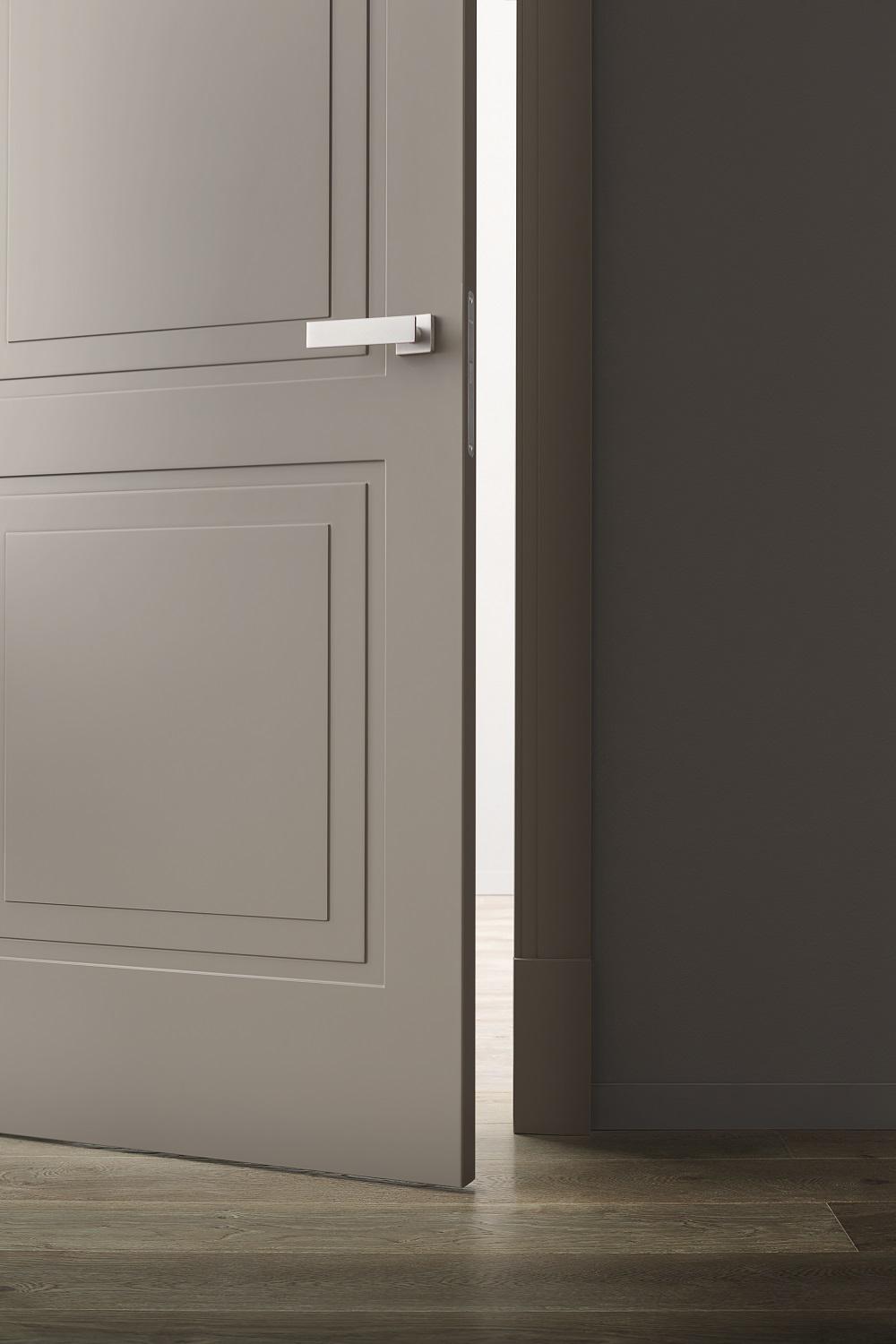 Swing wood door 41 mm thick with one, two or three recessed panels. Magnetic lockset, concealed hinges and anti-noise gasket included. Wood jamb. Trim 15 mm thickness, flush with the door on the pull side. Telescopic wood trim for wall thickness from 110 to 135 mm. Available for max wall thickness 500 mm.
