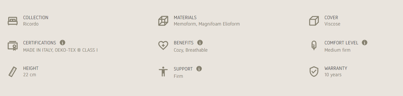 Ricordo 9 of the Ricordo collection is the ideal mattress for anyone who wants a firm but comfortable and cozy support to their back, thanks to the Memoform contained in the padding. All in 22 cm of height.