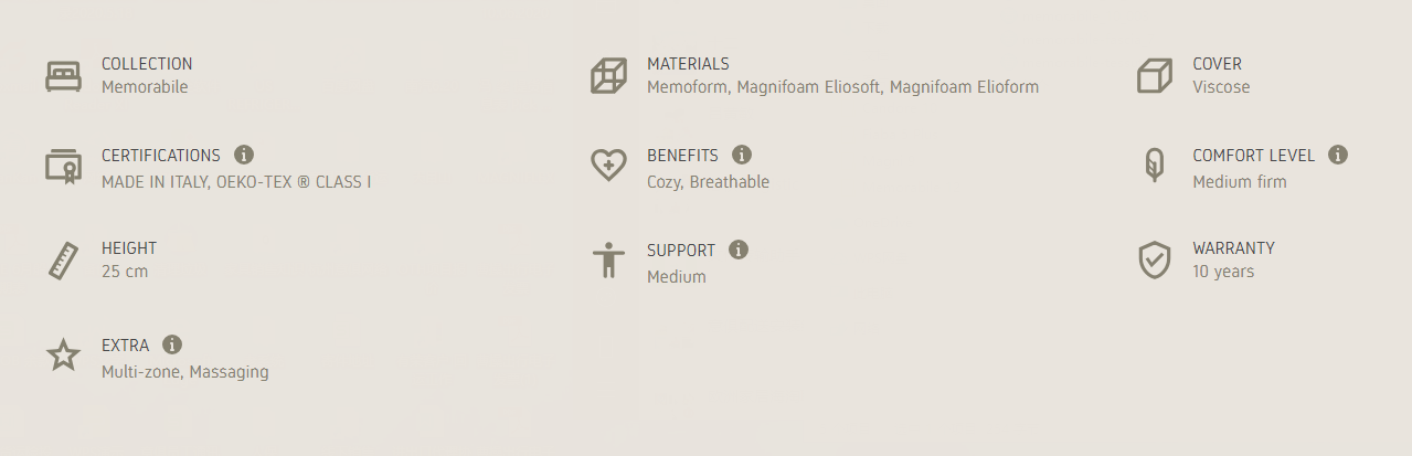 Memorabile 10 of the Memorabile collection, with the massaging effect provided by the inner layer, offers ideal support to the different parts of the body. A pleasant and customized comfort in 25 cm of height.