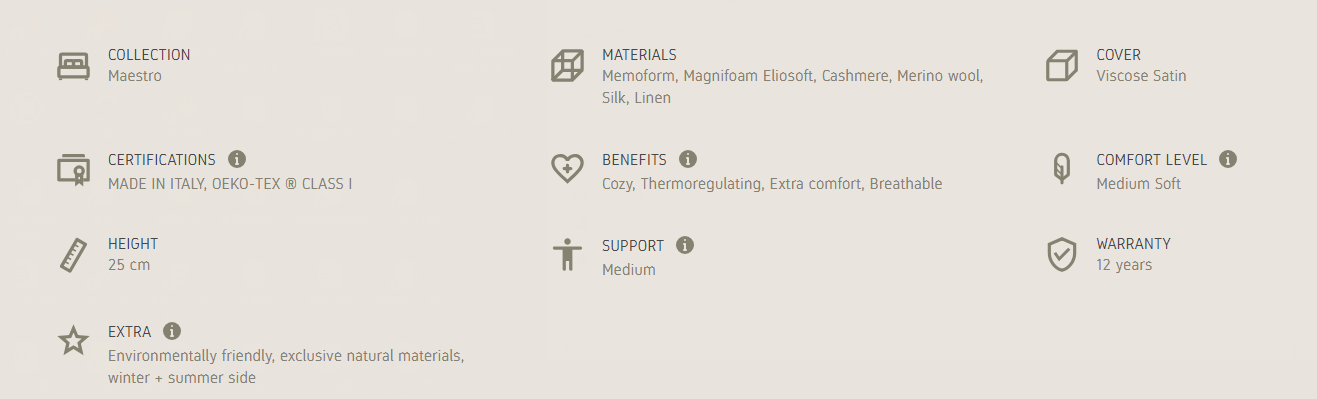 Maestro 10 combines the excellence of traditional materials with the innovation of new technologies to create a timeless elegance and comfort. The natural fibers combined with the support provided by Eliosoft and Memoform offer a Medium Soft comfort and coziness in both summer and winter, at 25 cm of height.