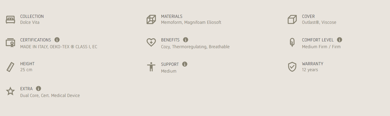 Comfort Dual 10 Firm of the Dolce Vita line is inspired to the excellence of Made in Italy and Italian lifestyle. The combination of materials like Memoform and Eliosoft, along with the refined lining in Viscose and the innovative Outlast? fabric, provide a firm support in 25 cm of height. The Dual Core technology ensures the perfect comfort for couples with different comfort preferences.