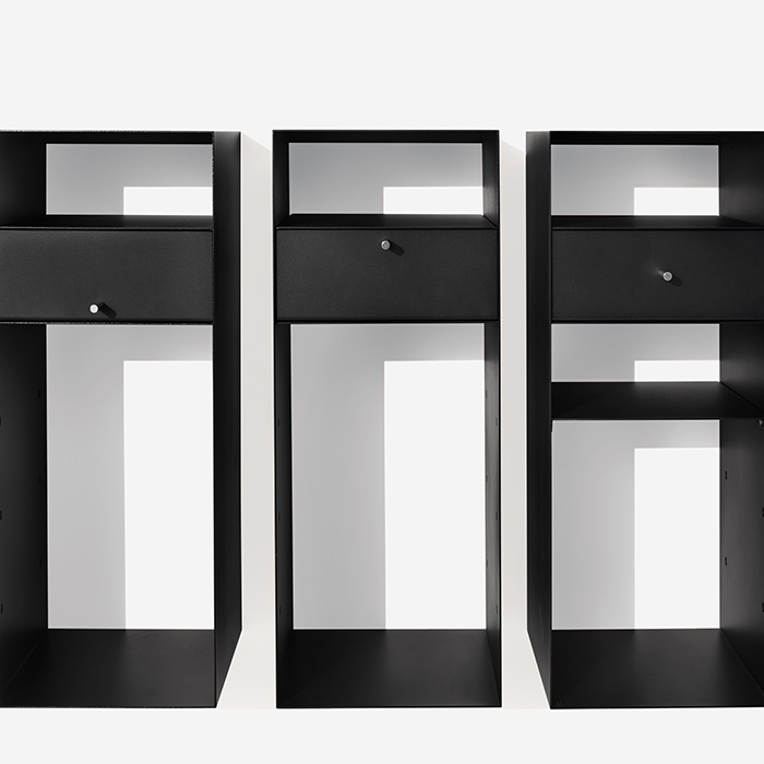 Three basic modules to draw a wall by alternating solids and voids. A highly customisable system of open cabinets that can be equipped with shelves and drawers, C.O.P. is designed to be efficient thanks to smart technical solutions, without sacrificing the pleasure of geometric decoration.