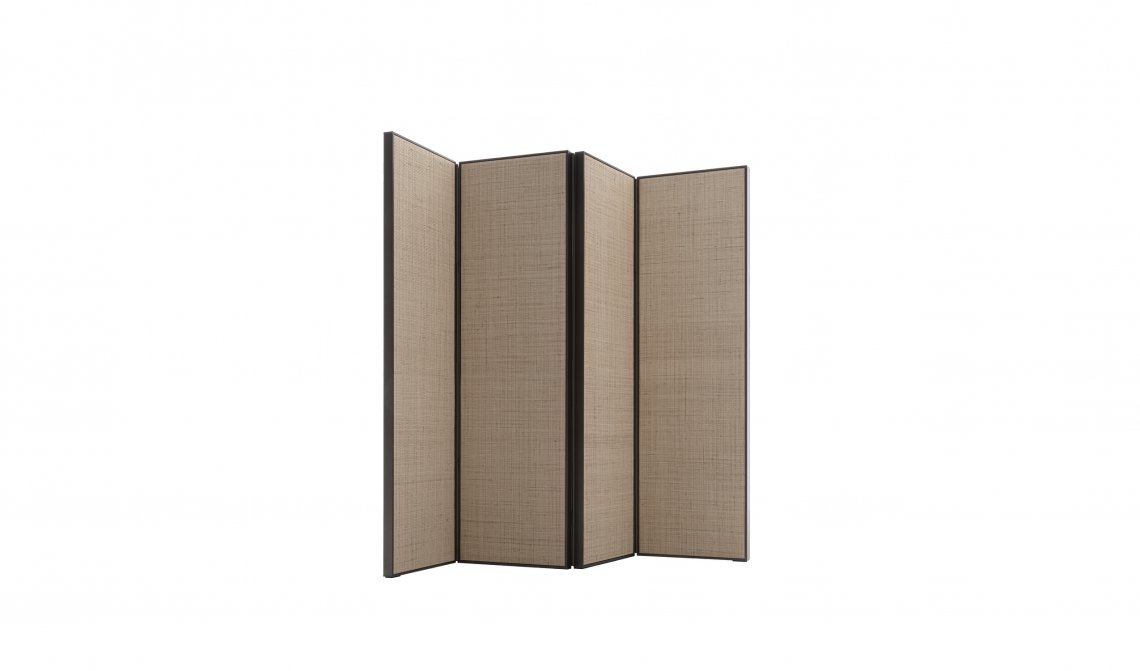 Only a complementary piece in appearance, the Privatus windscreen responds to the need to define the spaces in large rooms of stately homes; for example, this can be used between reception and dining areas, or behind the headboard of the bed to outline the sleeping area. The panels are covered with a handmade fabric, composed of 50% raffia and 50% banana leaf, and fixed on a support for greater stability. The panel is thus slightly sound-absorbing and endowed with a tangible materiality without being intrusive. The profile is made of bronzed nickel and painted aluminium. It consists of three, four or eight panels.