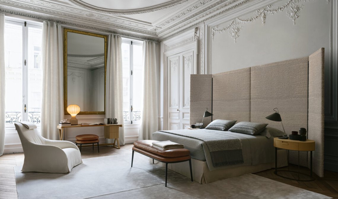 The Dike bed stands out for its long slip cover in harmony with a precious concept of the bedroom area. The bed sides can be covered with numerous fabrics from the collection. In addition to the headboard of the same series, the Dike bed can also be combined with all the headboards in the collection.