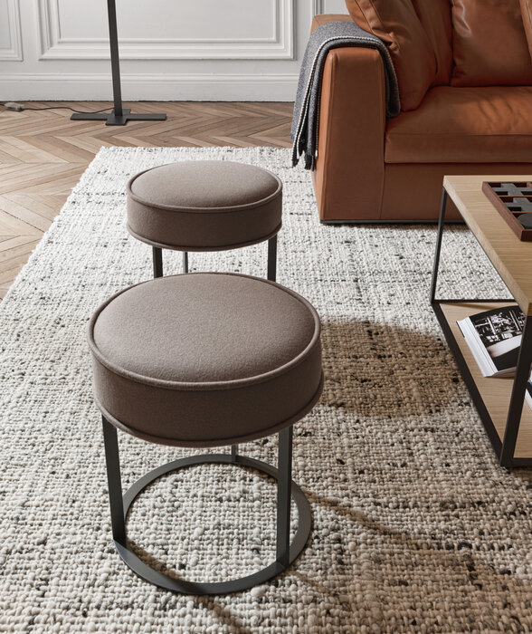Whether used as an additional seat as a decorative element, the Lithos ottoman stands out for its metal frame and rounded seat characterised by a high cushion for exceptional comfort.
