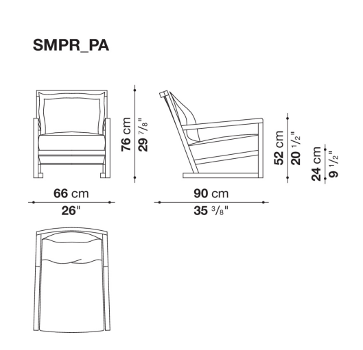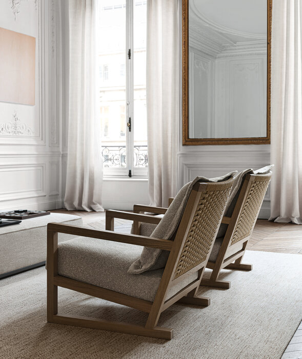 The Clio armchair is characterised by a light but solid frame in solid wood available in different finishes. The backrest echoes the same finishes as the frame and can be covered in leather or fabric or with natural cellulose rope interlacing. Comfort is ensured by an upholstered seat cushion and a back cushion with flounces.