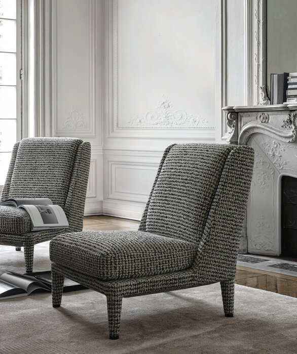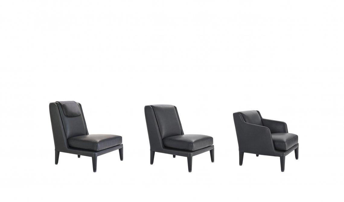 The Nidus armchairs, like the curved sofa of the same series, are designed as elements to be grouped in a free, casual manner, fostering socialisation and conversation in a harmonious and relaxed setting. They come in three fabric or leather covered versions that incorporate the feet, with a small metal detail at the base serving as a decorative feature that also offers protection from impact. For utmost comfort, the version with the highest backrest comes with a removable headrest.