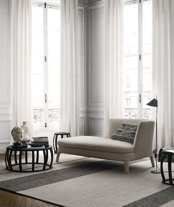 Febo is a family of seats that carries with it the memory of a traditional design distinguished by a large enveloping back without armrests. The sofas, available as two-seater or three-seater, come in two sizes: a smaller one with low or high seat cushion and a larger one. The upholstery is in fabric or leather with visible blanket stitching. The base-frame and legs are in solid wood and are also available in a single-material version, covered in fabric or leather like the cushions.