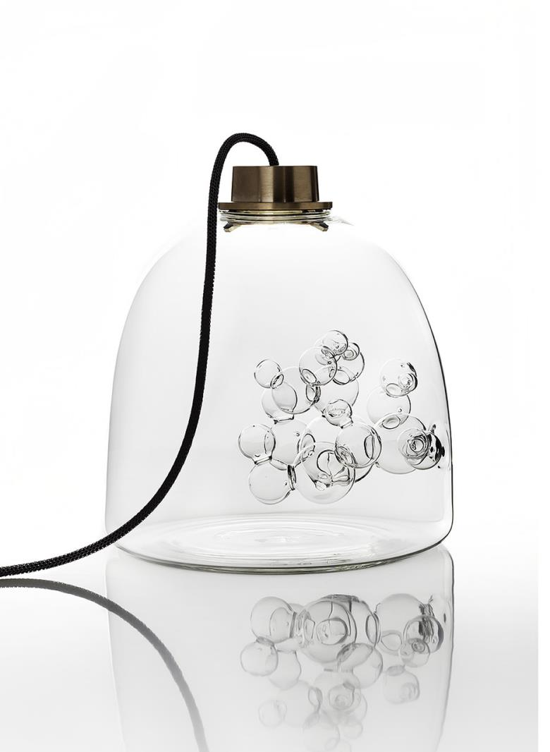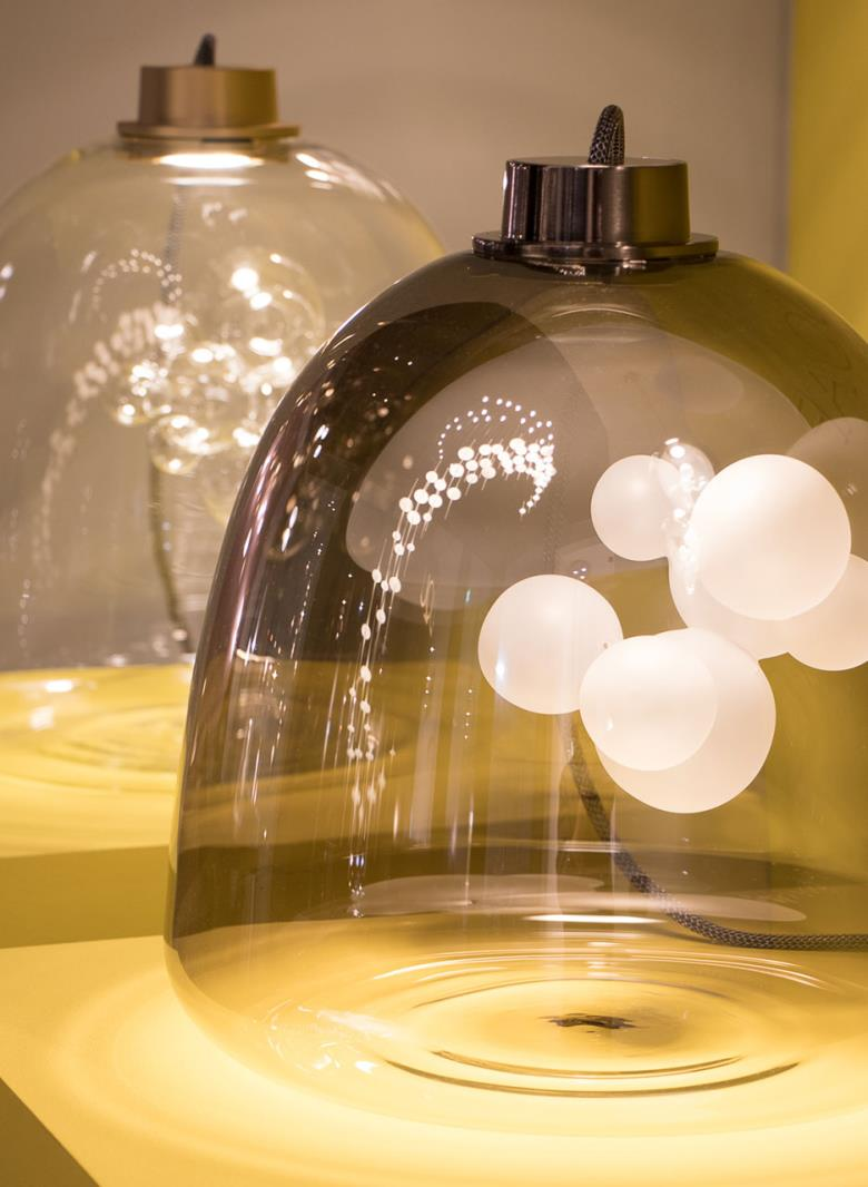 Suspension lamp. Hand blown titanium metallized glass dome with internal frosted bubble glass sculpture.