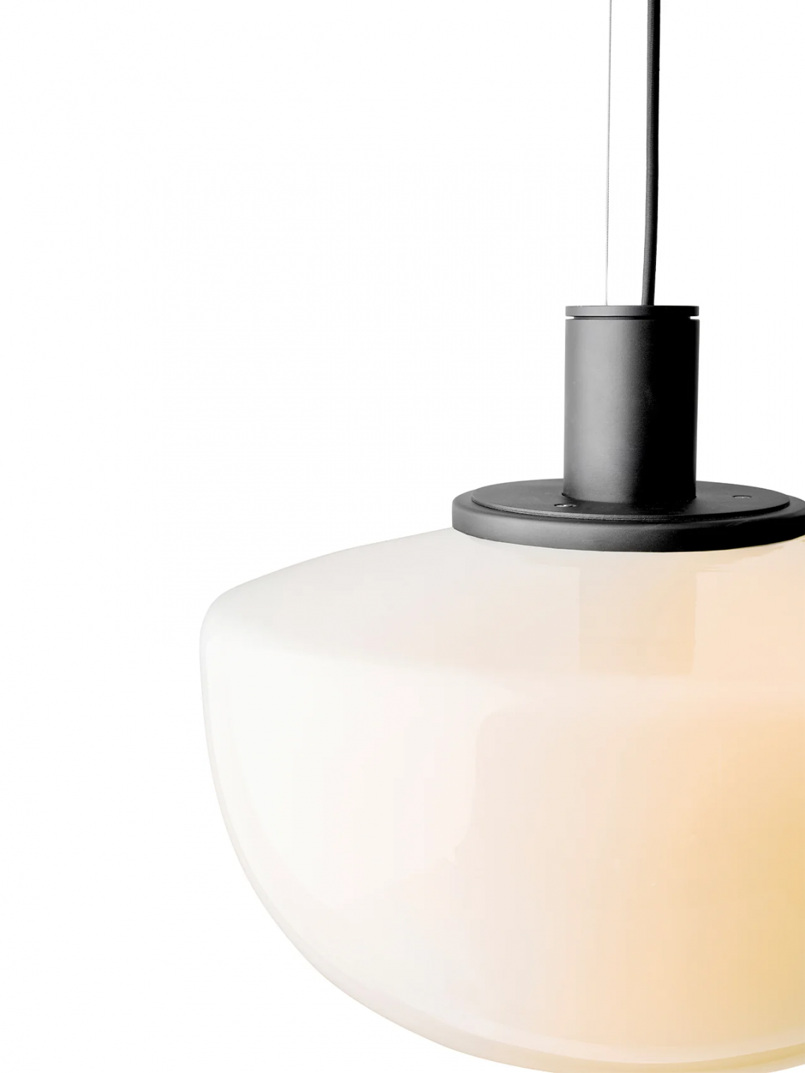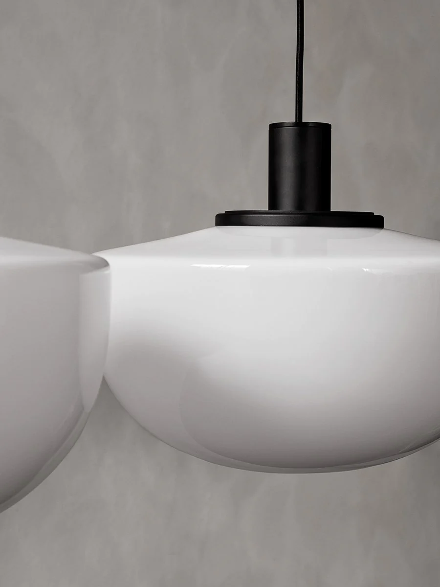 The Bank Pendant is an indoor, semicircular pendant crafted from opal or smoke mouth-blown glass and black powder-coated aluminum fittings. The opaque glass gently diffuses 360-degree light from any E26 bulb, creating ambience and providing excellent task lighting