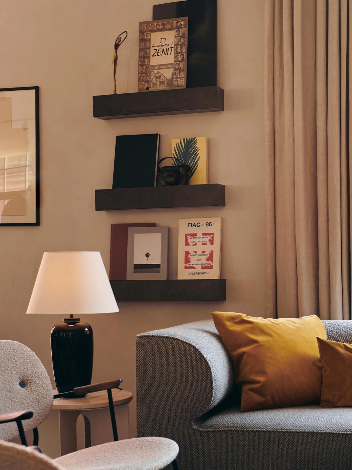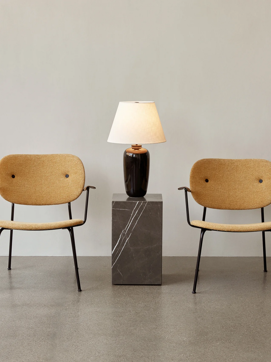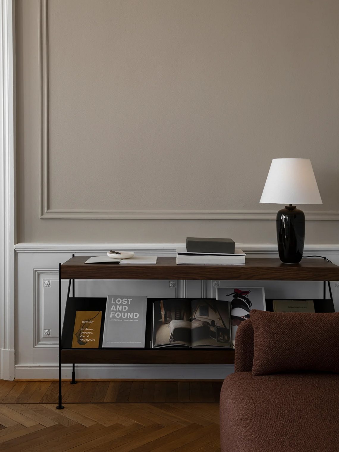 The transformative powers of light come into play on the Torso Table Lamp by Kr?yer-S?tter-Lassen, designed with a timeless look that lends itself to any setting. The elongated base — cast from black-glazed stoneware and elongated for an understated yet sculptural expression — holds a tactile linen shade that diffuses the light to create instant ambience. A brass touch dimmer allows for a personal setting.