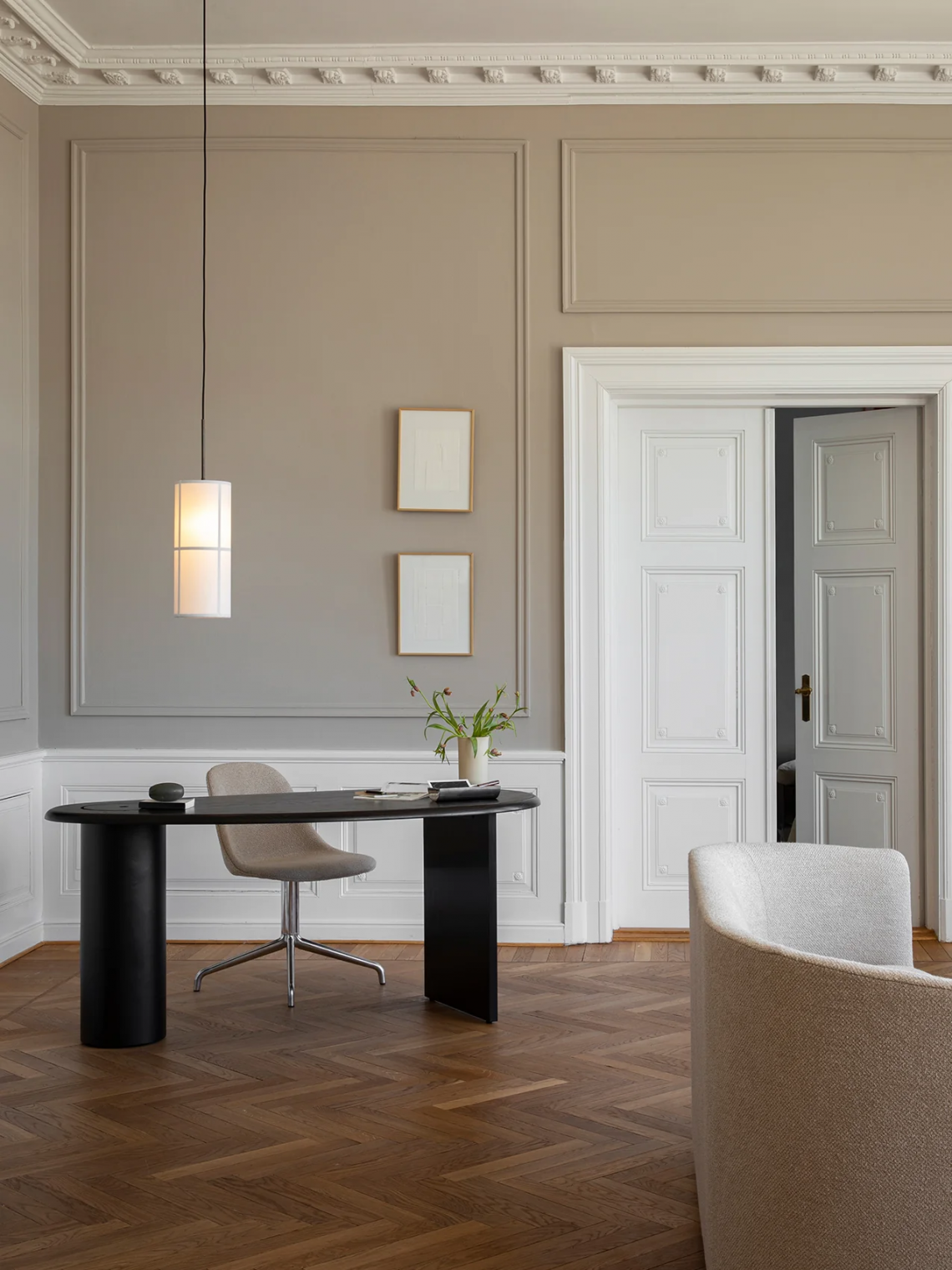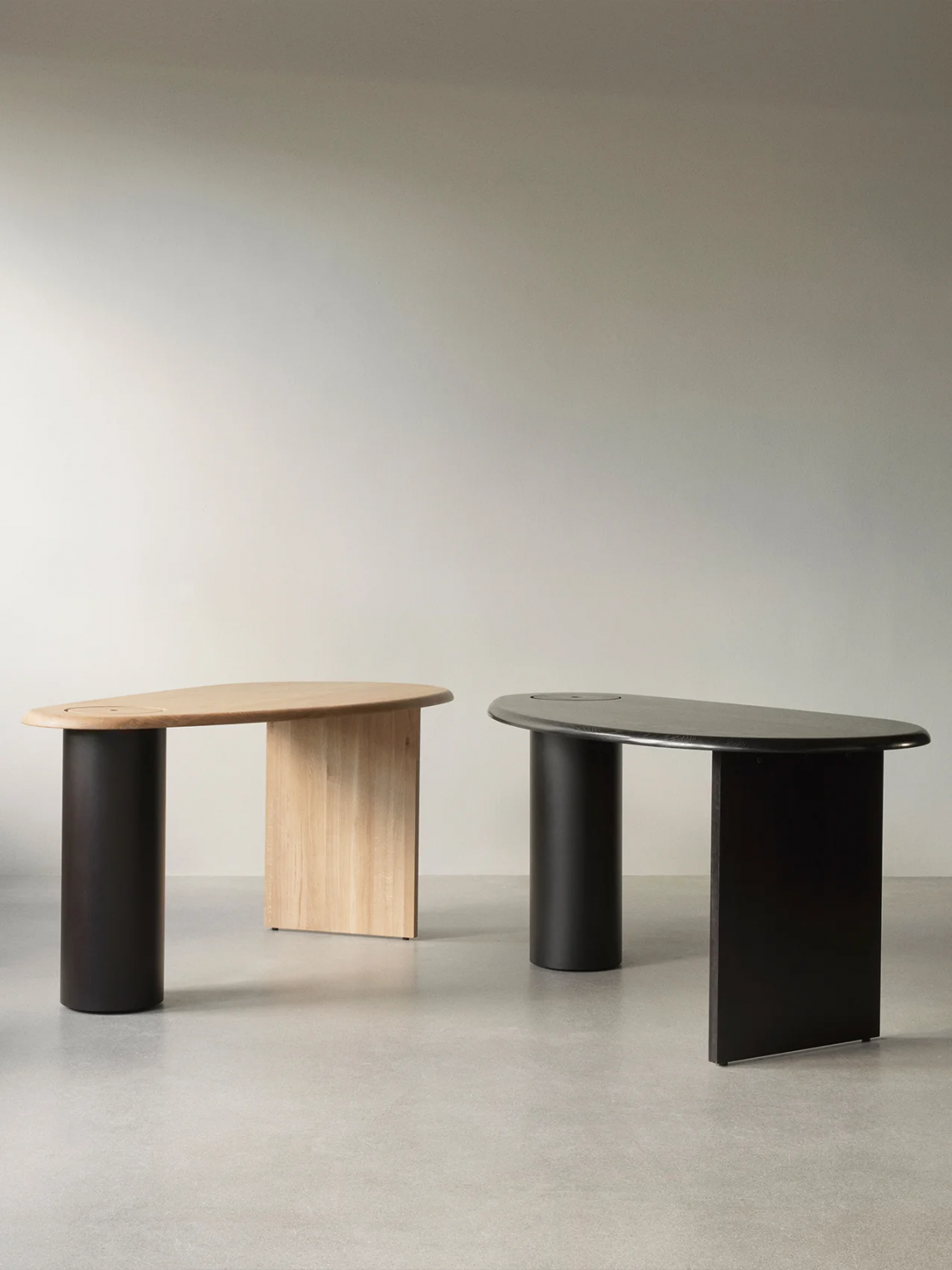 The Eclipse Desk is a celebration of materials and form. Named after its concave and convex form that resembles the illuminated passage of celestial bodies in the sky, the Fred Rigby design has a distinctive, asymmetrical silhouette that invites to touch. Available in solid oak, dark-oiled oak and oiled natural oak with a black painted leg, the tabletop is fitted with a lid that lifts to reveal hidden storage within the supportive steel column, ensuring desk space remains free of clutter. Designed to stand alone as a centrepiece in the middle of a room or for placement up against a wall as a more conventional piece of home office furniture, its intriguing form draws the eye.H: 75 cm, W: 160 cm, D: 80 cm