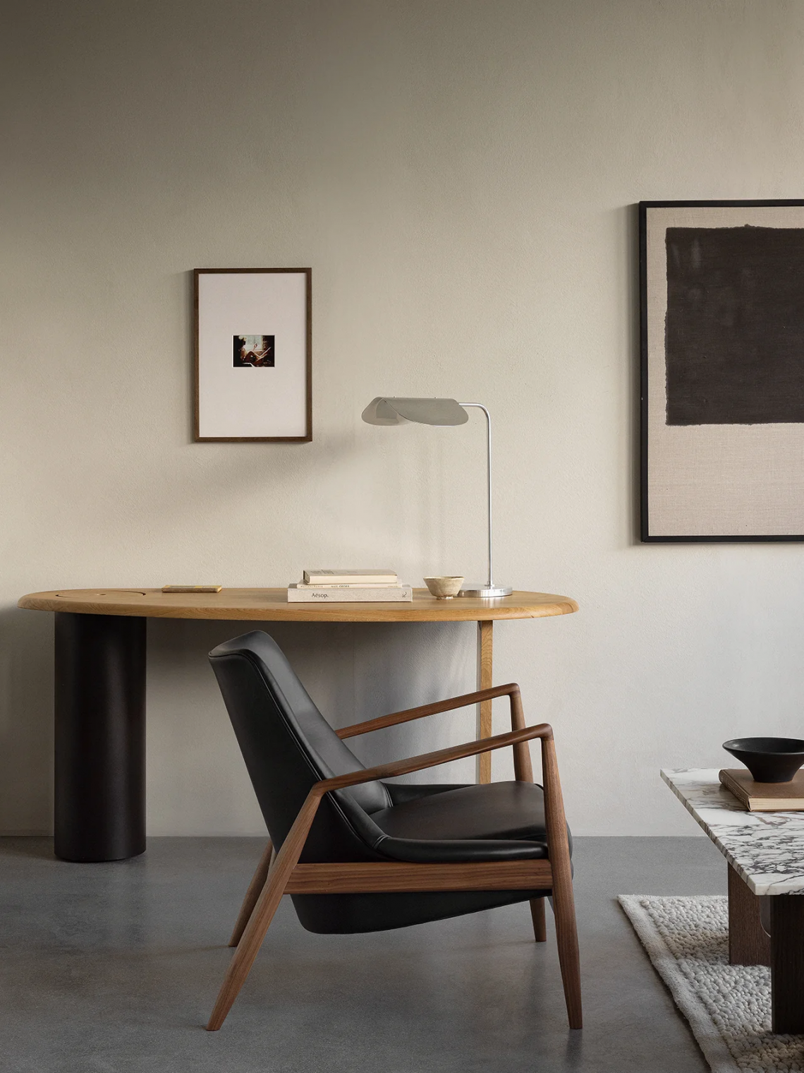 Arguably one of Ib Kofod-Larsen's best-known designs, The Seal is an elegant armchair typical of its time – and yet entirely timeless. The angled frame and armrests and leather upholstery put comfort at the fore, inviting lounging. And despite being made of heavy materials, it has a lightness to it; the shell appears to float inside the wooden frame. Named after the Swedish ski resort, S?len, and not the animal, The Seal is a fine example of Ib Kofod-Larsen's organic design and focus on detail and comfort. The chair is available with a low or high back.