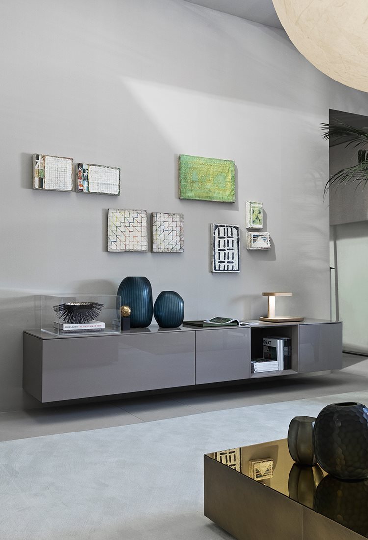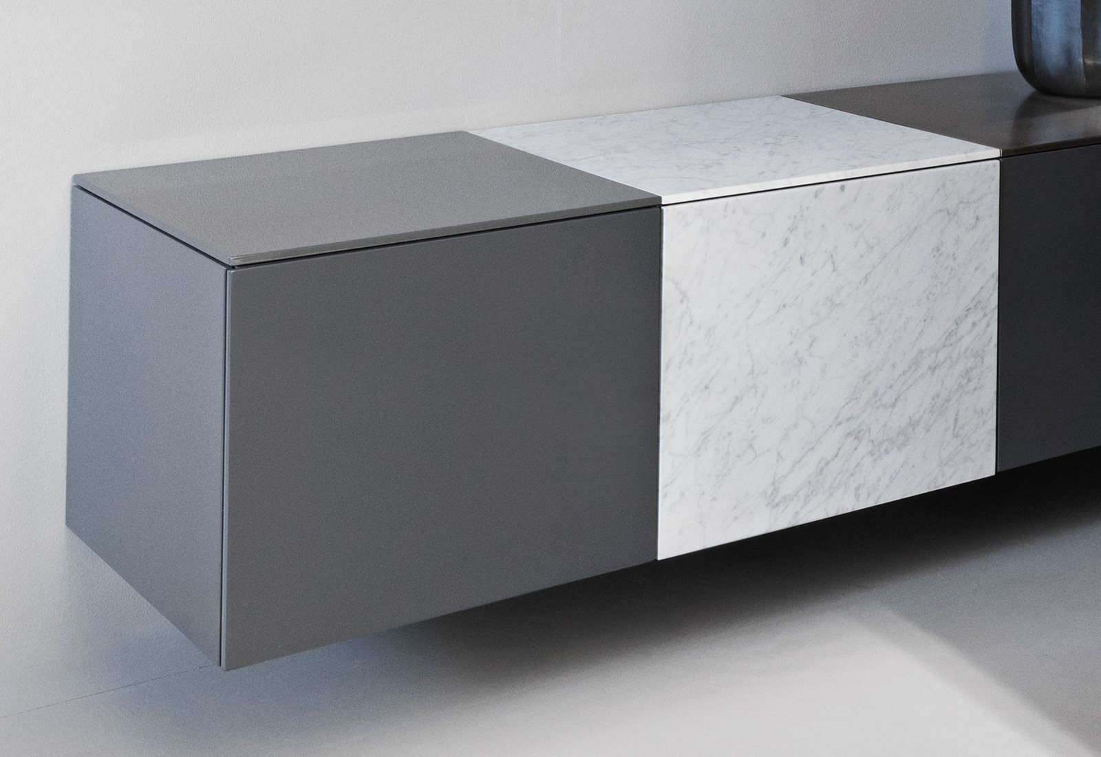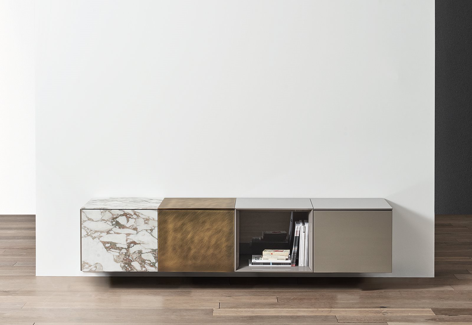 一系列以純線條為特征的壁掛式模塊化單元,結(jié)合多種飾面:敞開式隔間,抽屜和落葉門等可以呈現(xiàn)多種形式,分割性和包含性,進(jìn)而配合木材,烤漆,銅和大理石面板非常具有靈活性和多樣的組合性。