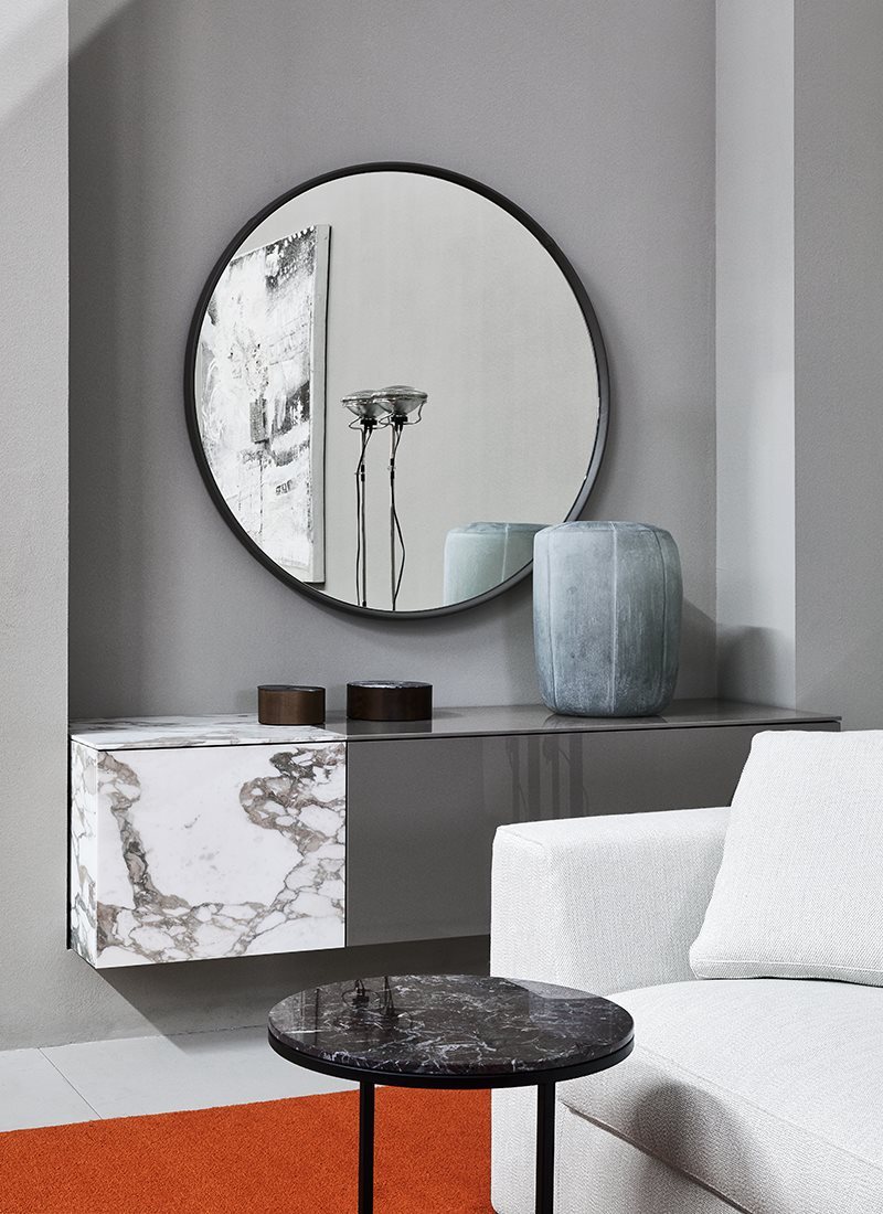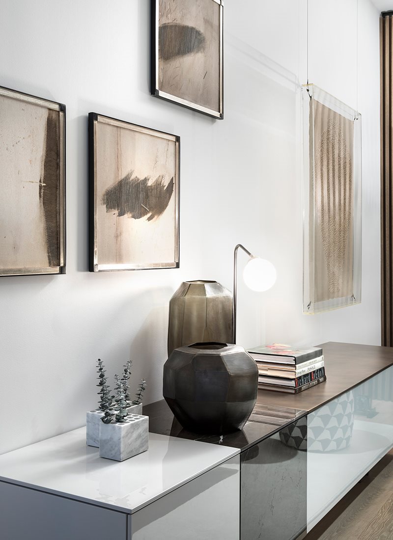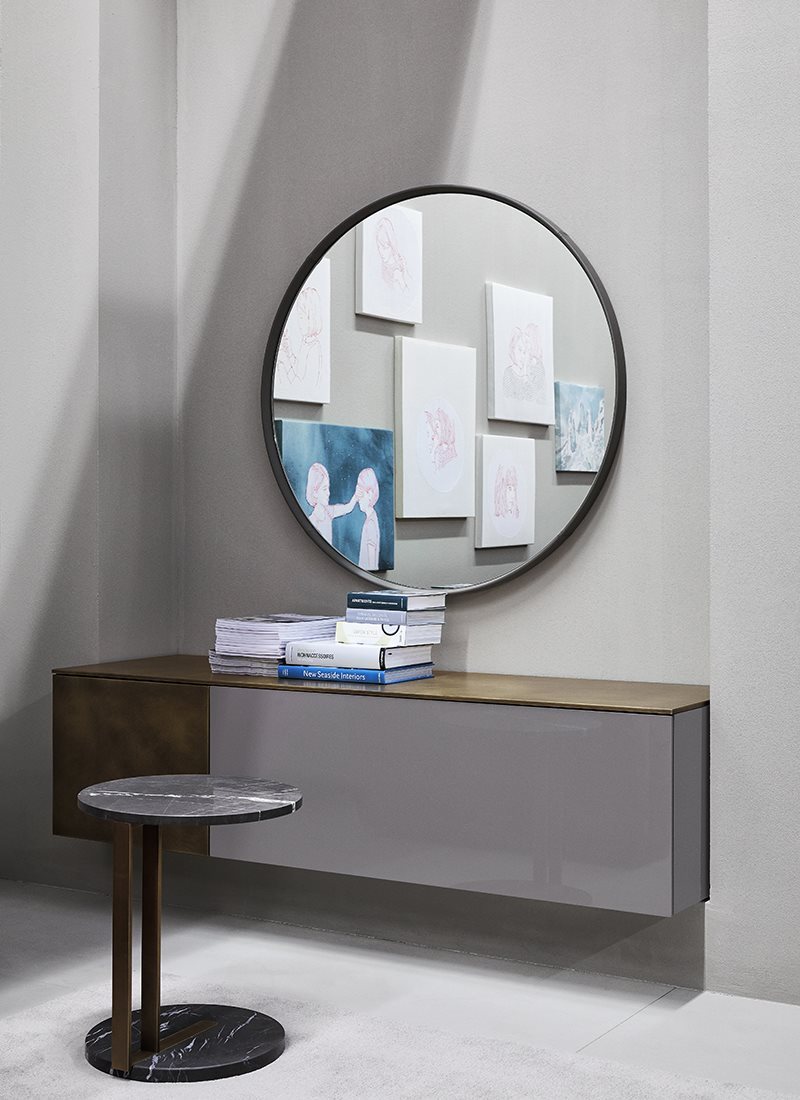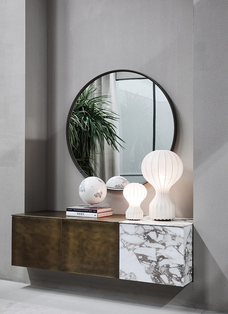 一系列以純線條為特征的壁掛式模塊化單元,結(jié)合多種飾面:敞開式隔間,抽屜和落葉門等可以呈現(xiàn)多種形式,分割性和包含性,進(jìn)而配合木材,烤漆,銅和大理石面板非常具有靈活性和多樣的組合性。