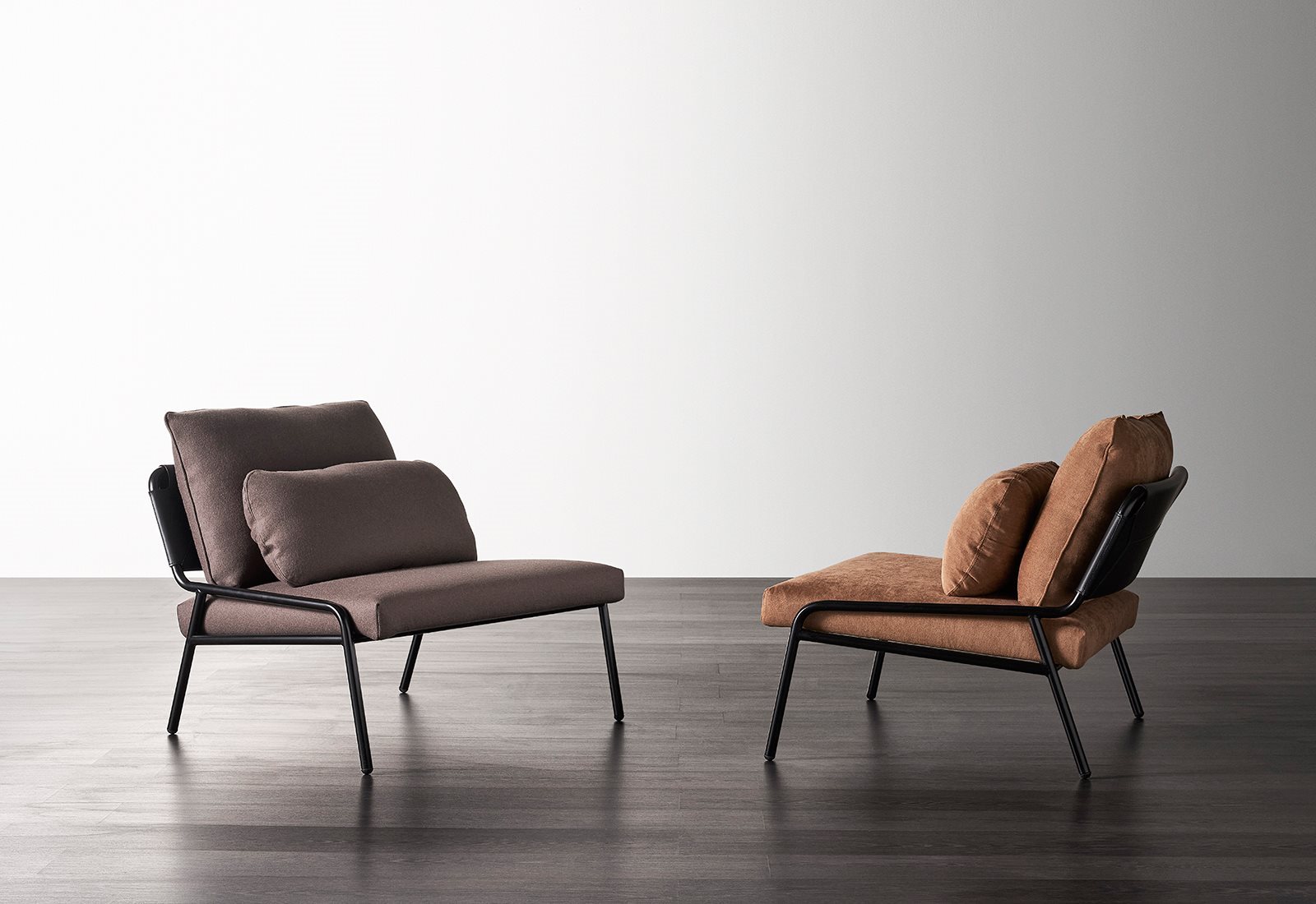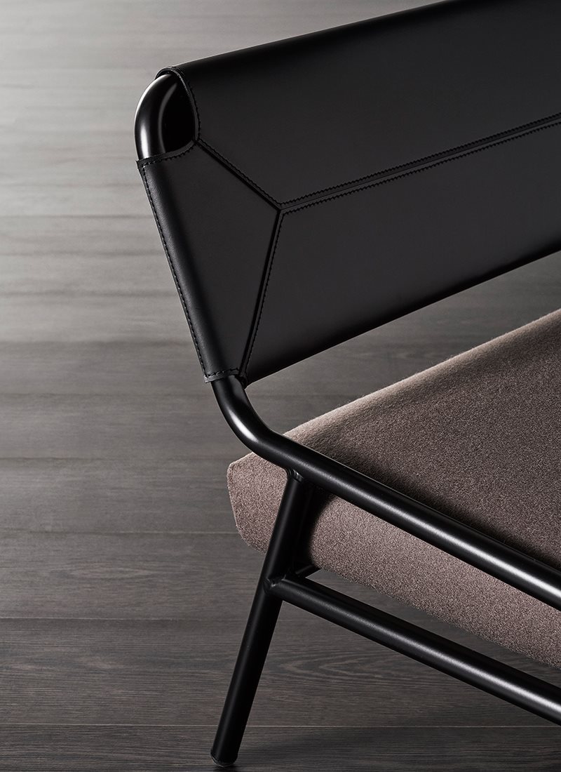 Zoe is a collection of armchairs characterized by the special combination of different materials, such as aluminium and saddle leather. The latter is wisely worked to give life to a backrest with sartorial stitchings or with hand-woven saddle leather rope. Zoe has a padded seat and two optional back cushions make this armchair even more comfortable and versatile.