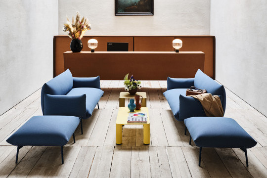 Two-seat sofa with painted metal legs. Seat and backrest upholsteres in